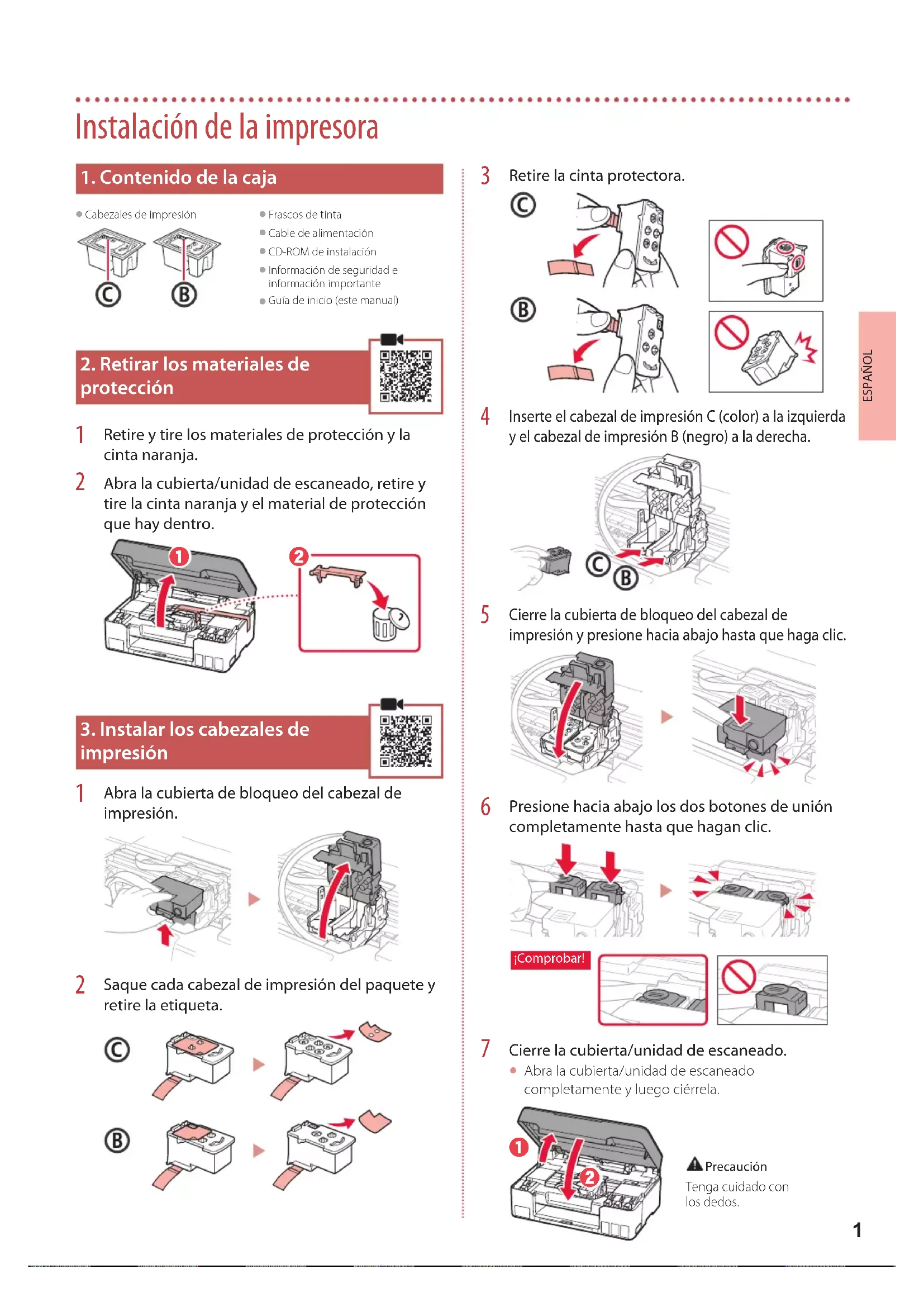 Cabezales de impresión Frascos de tinta Cable de alimentación CD-ROM de instalación Información de seguridad e información importante Guía de inicio (este manual)