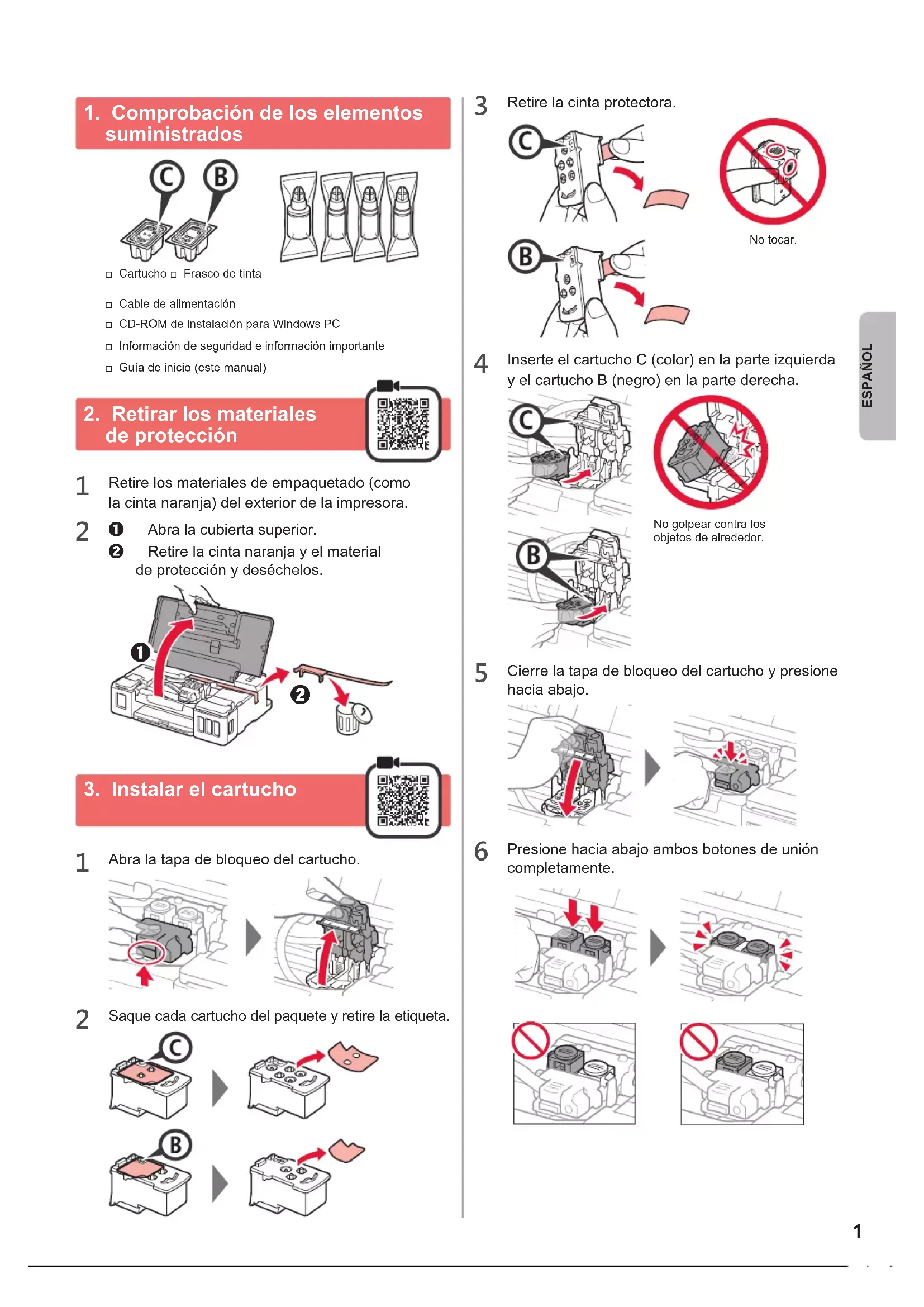 suministrados □ Cable de alimentación □ Información de seguridad e información importante □ Guía de inicio )este manual( □ CD-ROM de instalación para Windows PC □ Cartucho □ Frasco de tinta