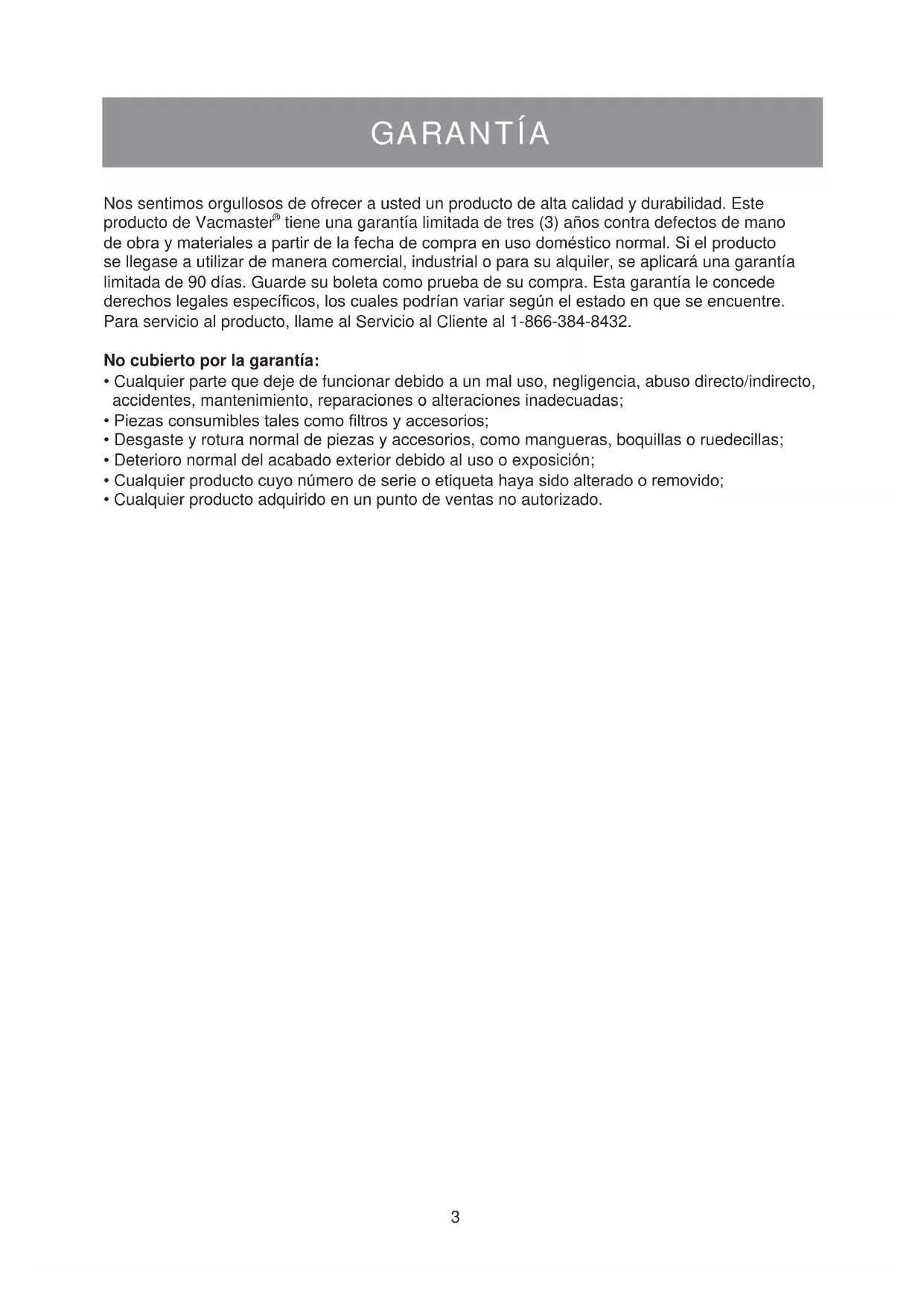 GALONES ³7DPDxRGHO7DQTXH´VHUH¿HUHDOYROXPHQUHDOGHOWDQTXH\QRUHÀHMDODFDSDFLGDGGLVSRQLEOH durante la operación. HP PICO “PICO HP” es un término que se utiliza en la industria de aspiradoras seco/mojado para propósitos de comparación. No denota la potencia en caballos de fuerza operativos de una aspiradora seco/mojado, sino más bien la potencia en caballos de fuerza de un motor, incluida la contribución inercial del motor lograda en pruebas de laboratorio. En el uso real, los motores no funcionan a la potencia máxima indicada.3 GARANTÍA Nos sentimos orgullosos de ofrecer a usted un producto de alta calidad y durabilidad. Este producto de Vacmaster