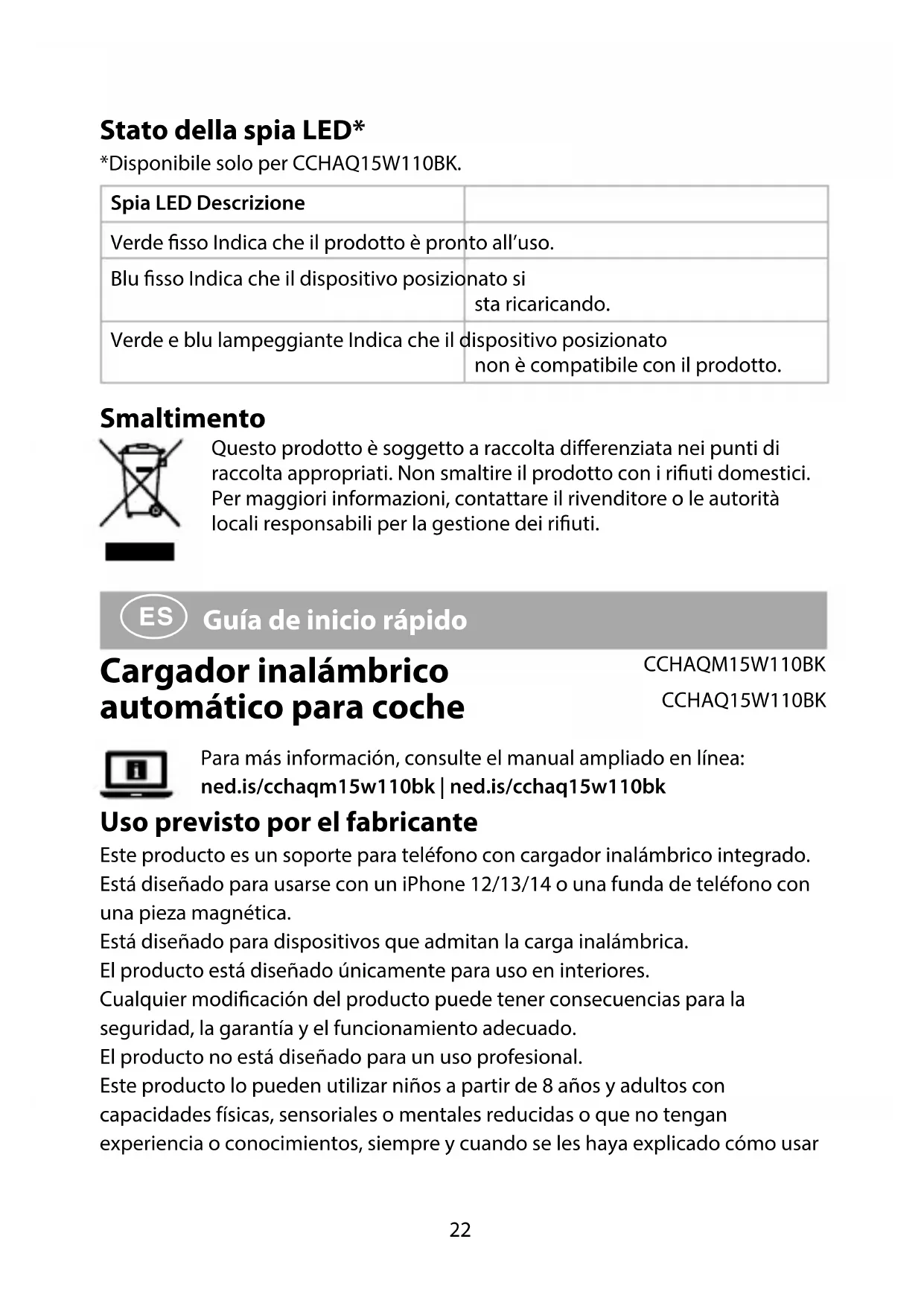 Para más información, consulte el manual ampliado en línea: ned.is/cchaqm15w110bk | ned.is/cchaq15w110bk Uso previsto por el fabricante Este producto es un soporte para teléfono con cargador inalámbrico integrado. Está diseñado para usarse con un iPhone 12/13/14 o una funda de teléfono con una pieza magnética. Está diseñado para dispositivos que admitan la carga inalámbrica. El producto está diseñado únicamente para uso en interiores. Cualquier modicación del producto puede tener consecuencias para la seguridad, la garantía y el funcionamiento adecuado. El producto no está diseñado para un uso profesional. Este producto lo pueden utilizar niños a partir de 8 años y adultos con capacidades físicas, sensoriales o mentales reducidas o que no tengan experiencia o conocimientos, siempre y cuando se les haya explicado cómo usar23 el producto de forma segura y los riesgos que implica o se les supervise. Los niños no deben jugar con el producto. Los niños no deben realizar las tareas de limpieza ni mantenimiento sin supervisión. Partes principales (imagen A) 1 Placa de carga CCHAQ15W110BK 2 Abrazadera 3 Anillo de ajuste 4 Botón de liberación de abrazadera e indicador LED 5 Puerto de carga USB-C 6 Cabeza esférica 7 Anillo de ajuste del clip 8 Clip para rejilla 9 Fijación q Placa de carga magnética