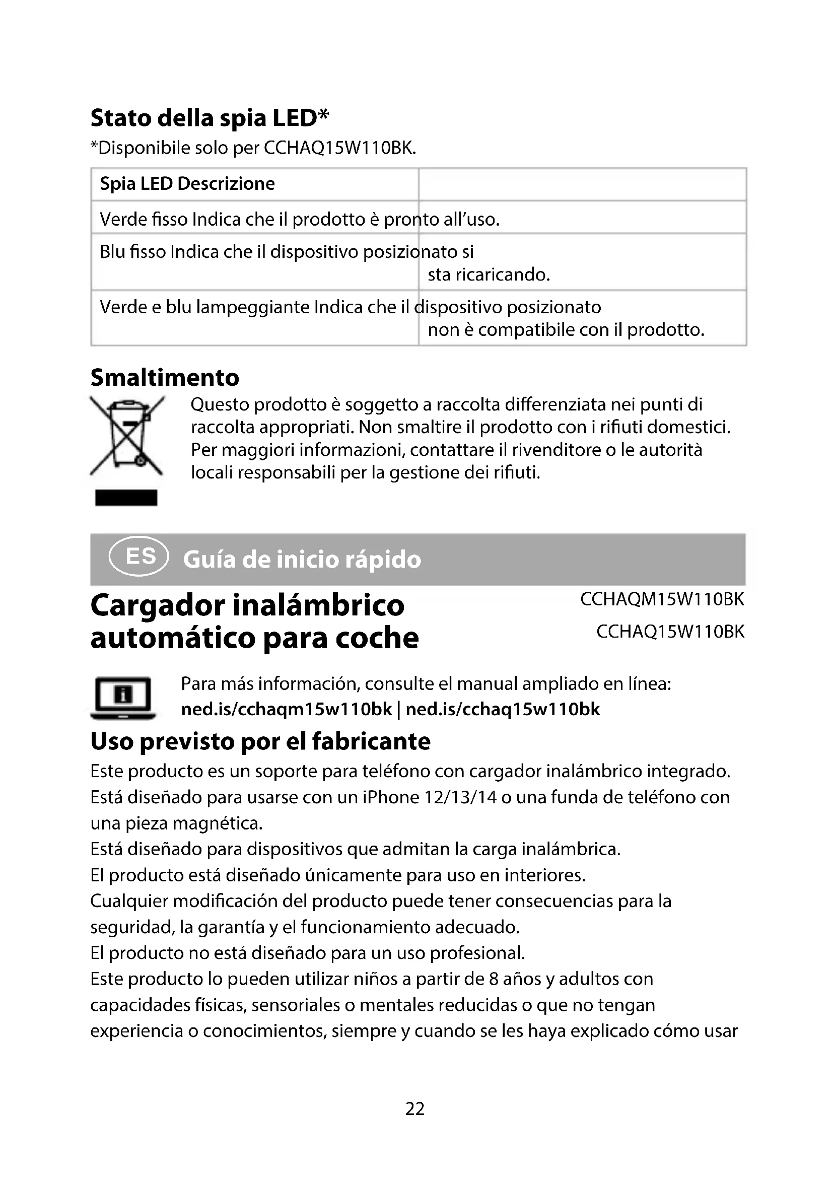Estado del indicador LED* *Aplicable sólo a CCHAQ15W110BK. Indicador LED Descripción Verde sólido Indica que el producto está listo para su uso. Azul sólido Indica que el dispositivo colocado se está cargando. Verde y azul parpadeante Indica que el dispositivo colocado no es compatible con el producto. Eliminación El producto está diseñado para desecharlo por separado en un punto de recogida adecuado. No se deshaga del producto con la basura doméstica. Para obtener más información, póngase en contacto con el vendedor o la autoridad local responsable de la eliminación de residuos.26