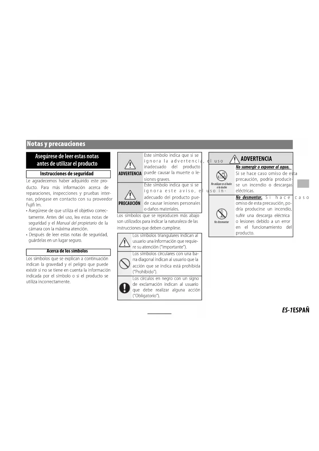 ADVERTENCIA ADVERTENCIA No utilizar en el baño o la ducha No sumergir o exponer al agua. Si se hace caso omiso de esta precaución, podría producir- se un incendio o descargas eléctricas. No desmontar No desmontar. Si hace caso omiso de esta precaución, po- dría producirse un incendio, sufrir una descarga eléctrica o lesiones debido a un error en el funcionamiento del producto.ES-2 ESPAÑOL