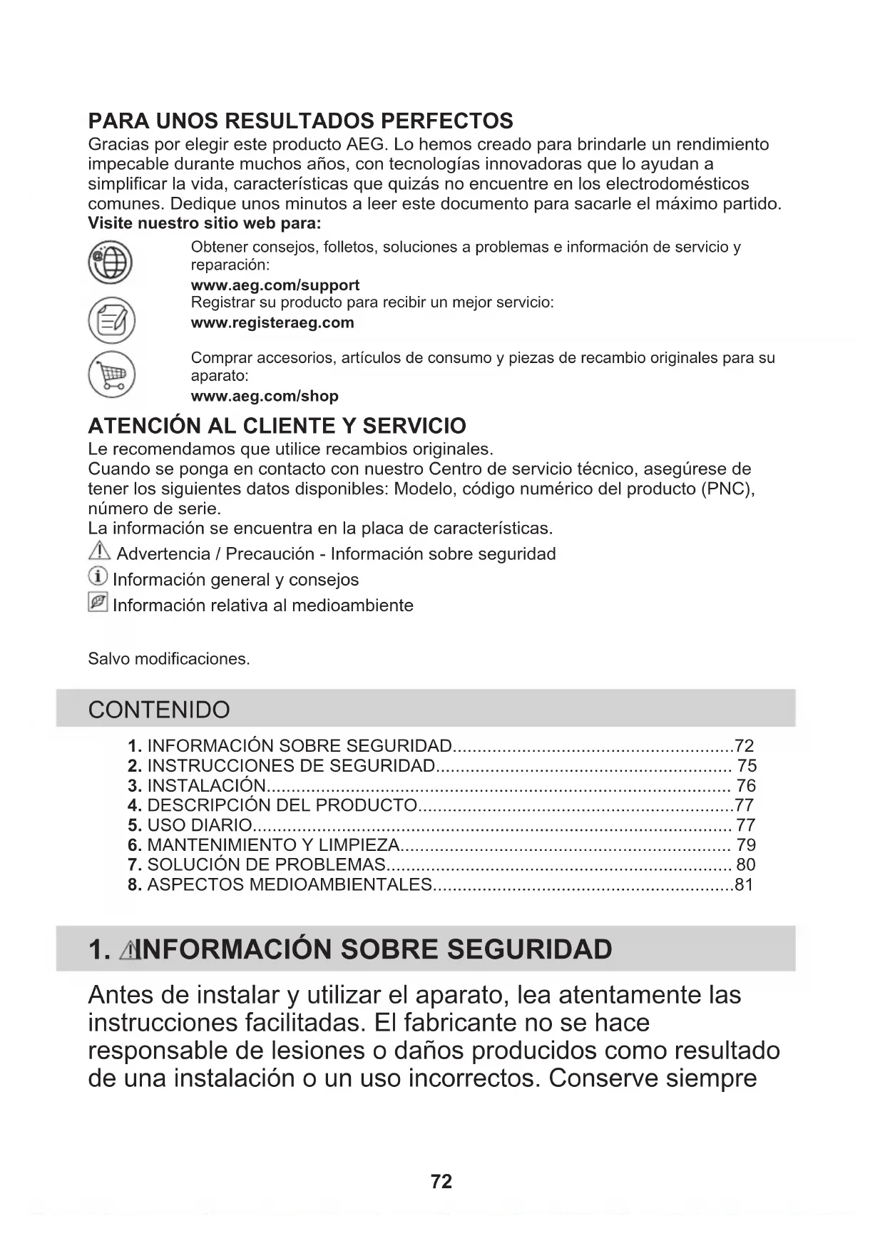 Gracias por elegir este producto AEG. Lo hemos creado para brindarle un rendimientoimpecable durante muchos años, con tecnologías innovadoras que lo ayudan asimplificar la vida, características que quizás no encuentre en los electrodomésticoscomunes. Dedique unos minutos a leer este documento para sacarle el máximo partido.Visite nuestro sitio web para:Obtener consejos, folletos, soluciones a problemas e información de servicio yreparación:www.aeg.com/supportRegistrar su producto para recibir un mejor servicio:www.registeraeg.comComprar accesorios, artículos de consumo y piezas de recambio originales para suaparato:www.aeg.com/shop