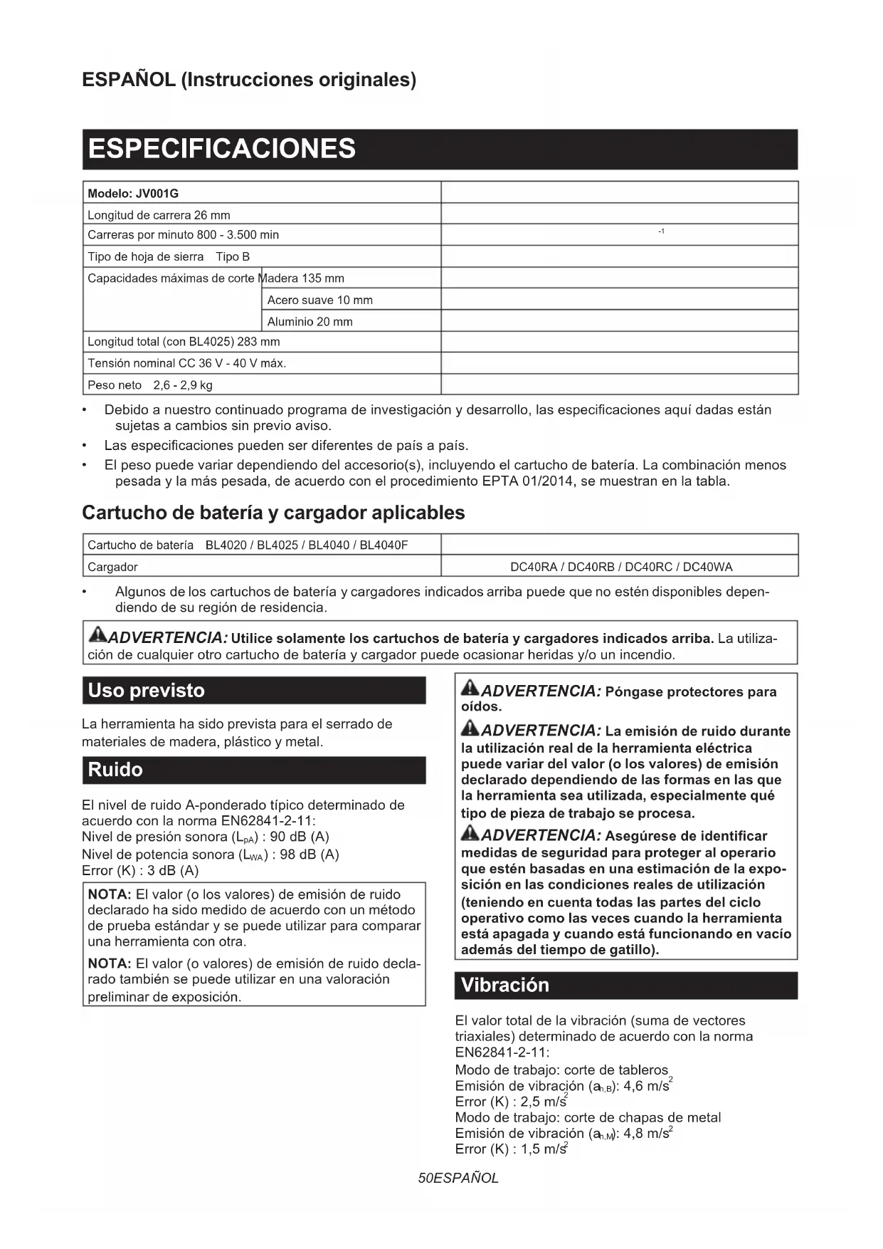 - Algunosdeloscartuchosdebateríaycargadoresindicadosarribapuedequenoesténdisponiblesdepen- diendo de su región de residencia. ADVERTENCIA: Utilice solamente los cartuchos de batería y cargadores indicados arriba. La utiliza- cióndecualquierotrocartuchodebateríaycargadorpuedeocasionarheridasy/ounincendio. Uso previsto La herramienta ha sido prevista para el serrado de materiales de madera, plástico y metal. Ruido ElnivelderuidoA-ponderadotípicodeterminadode acuerdoconlanormaEN62841-2-11: Nivel de presión sonora (L