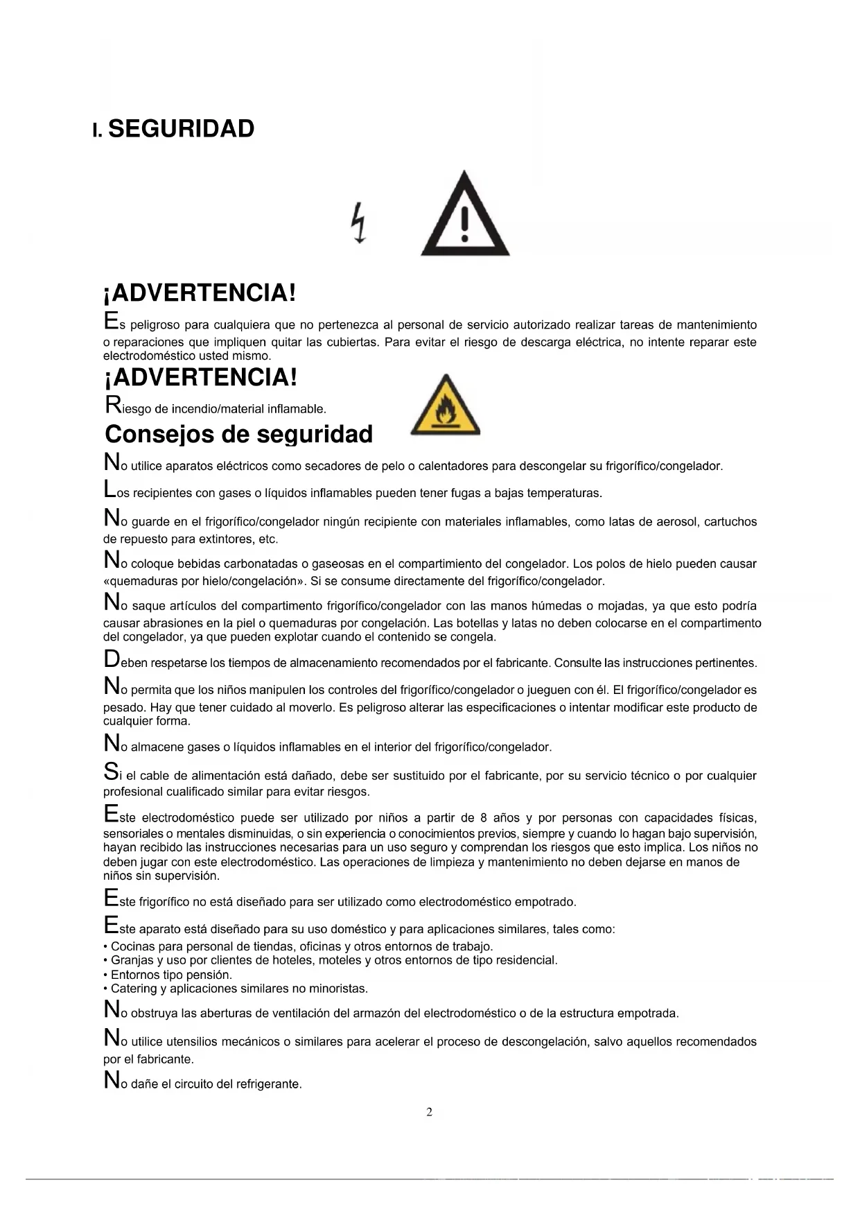 ¡ADVERTENCIA! Es peligroso para cualquiera que no pertenezca al personal de servicio autorizado realizar tareas de mantenimiento o reparaciones que impliquen quitar las cubiertas. Para evitar el riesgo de descarga eléctrica, no intente reparar este electrodoméstico usted mismo. ¡ADVERTENCIA! Riesgo de incendio/material inflamable. Consejos de seguridad No utilice aparatos eléctricos como secadores de pelo o calentadores para descongelar su frigorífico/congelador. Los recipientes con gases o líquidos inflamables pueden tener fugas a bajas temperaturas. No guarde en el frigorífico/congelador ningún recipiente con materiales inflamables, como latas de aerosol, cartuchos de repuesto para extintores, etc. No coloque bebidas carbonatadas o gaseosas en el compartimiento del congelador. Los polos de hielo pueden causar «quemaduras por hielo/congelación». Si se consume directamente del frigorífico/congelador. No saque artículos del compartimento frigorífico/congelador con las manos húmedas o mojadas, ya que esto podría causar abrasiones en la piel o quemaduras por congelación. Las botellas y latas no deben colocarse en el compartimento del congelador, ya que pueden explotar cuando el contenido se congela. Deben respetarse los tiempos de almacenamiento recomendados por el fabricante. Consulte las instrucciones pertinentes. No permita que los niños manipulen los controles del frigorífico/congelador o jueguen con él. El frigorífico/congelador es pesado. Hay que tener cuidado al moverlo. Es peligroso alterar las especificaciones o intentar modificar este producto de cualquier forma. No almacene gases o líquidos inflamables en el interior del frigorífico/congelador. Si el cable de alimentación está dañado, debe ser sustituido por el fabricante, por su servicio técnico o por cualquier profesional cualificado similar para evitar riesgos. Este electrodoméstico puede ser utilizado por niños a partir de 8 años y por personas con capacidades físicas, sensoriales o mentales disminuidas, o sin experiencia o conocimientos previos, siempre y cuando lo hagan bajo supervisión, hayan recibido las instrucciones necesarias para un uso seguro y comprendan los riesgos que esto implica. Los niños no deben jugar con este electrodoméstico. Las operaciones de limpieza y mantenimiento no deben dejarse en manos de niños sin supervisión. Este frigorífico no está diseñado para ser utilizado como electrodoméstico empotrado. Este aparato está diseñado para su uso doméstico y para aplicaciones similares, tales como: