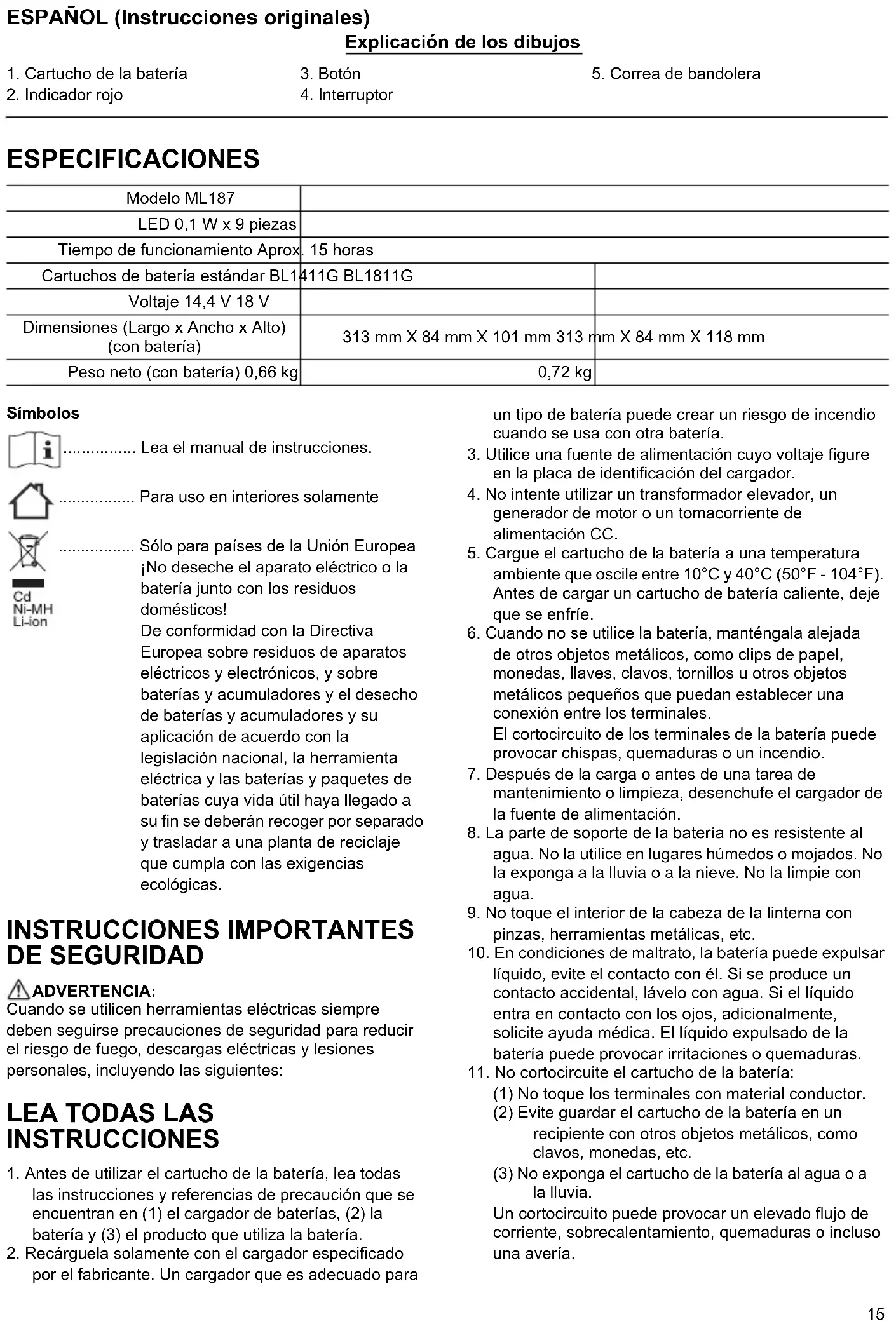 Modelo ML187 LED 0,1 W x 9 piezas Tiempo de funcionamiento Aprox. 15 horas Cartuchos de batería estándar BL1411G BL1811G Voltaje 14,4 V 18 V Dimensiones (Largo x Ancho x Alto) (con batería) 313 mm X 84 mm X 101 mm 313 mm X 84 mm X 118 mm Peso neto (con batería) 0,66 kg 0,72 kg16