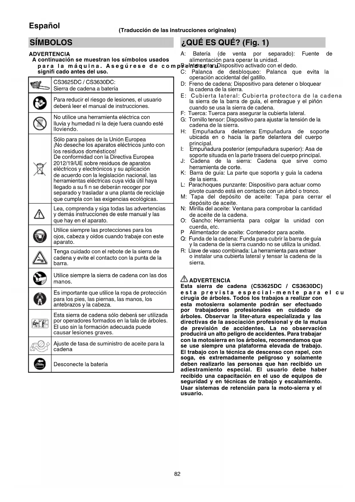- is verroest Slijp de zaagketting. Als de slijtage of beschadiging ernstig is, moet de zaagketting door een nieuwe worden vervangen. Controleer of de zaagketting omgekeerd zit. Bevestig de zaagketting opnieuw en let op de juiste richting. De zaagketting is niet voldoende gespannen. Controleer de kettingspanning en zet de ketting strakker als deze niet voldoende gespannen is. De kettingolie ○ stroomt te langzaam ○ komt helemaal niet naar buiten (zit vast) Geen kettingolie in de tank. Vul kettingolie bij. De kettingolietuit is verstopt. Reinig de kettingolietuit. De accu kan niet worden geïnstalleerd Proberen om een andere dan de voor het gereedschap voorgeschreven accu te plaatsen. Installeer alstublieft een multivolt accu. 00BookCS3625DCEU.indb8100BookCS3625DCEU.indb81 2022/12/0816:29:252022/12/0816:29:2582 Español (Traducción de las instrucciones originales) SÍMBOLOS ADVERTENCIA A continuación se muestran los símbolos usados para la máquina. Asegúrese de comprender su signifi cado antes del uso. CS3625DC / CS3630DC: Sierra de cadena a batería Para reducir el riesgo de lesiones, el usuario deberá leer el manual de instrucciones. No utilice una herramienta eléctrica con lluvia y humedad ni la deje fuera cuando esté lloviendo. Sólo para países de la Unión Europea ¡No deseche los aparatos eléctricos junto con los residuos domésticos! De conformidad con la Directiva Europea 2012/19/UE sobre residuos de aparatos eléctricos y electrónicos y su aplicación de acuerdo con la legislación nacional, las herramientas eléctricas cuya vida útil haya llegado a su fi n se deberán recoger por separado y trasladar a una planta de reciclaje que cumpla con las exigencias ecológicas. Lea, comprenda y siga todas las advertencias y demás instrucciones de este manual y las que hay en el aparato. Utilice siempre las protecciones para los ojos, cabeza y oídos cuando trabaje con este aparato. Tenga cuidado con el rebote de la sierra de cadena y evite el contacto con la punta de la barra. Utilice siempre la sierra de cadena con las dos manos. Es importante que utilice la ropa de protección para los pies, las piernas, las manos, los antebrazos y la cabeza. Esta sierra de cadena sólo deberá ser utilizada por operadores formados en la tala de árboles. El uso sin la formación adecuada puede causar lesiones graves. Ajuste de tasa de suministro de aceite para la cadena Desconecte la batería ¿QUÉ ES QUÉ? (Fig. 1) A: Batería (de venta por separado): Fuente de alimentación para operar la unidad. B: Interruptor: Dispositivo activado con el dedo. C: Palanca de desbloqueo: Palanca que evita la operación accidental del gatillo. D: Freno de cadena: Dispositivo para detener o bloquear la cadena de la sierra. E: Cubierta lateral: Cubierta protectora de la cadena de la sierra de la barra de guía, el embrague y el piñón cuando se usa la sierra de cadena. F: Tuerca: Tuerca para asegurar la cubierta lateral. G: Tornillo tensor: Dispositivo para ajustar la tensión de la cadena de la sierra. H: Empuñadura delantera: Empuñadura de soporte ubicada en o hacia la parte delantera del cuerpo principal. I: Empuñadura posterior (empuñadura superior): Asa de soporte situada en la parte trasera del cuerpo principal. J: Cadena de la sierra: Cadena que sirve como herramienta de corte. K: Barra de guía: La parte que soporta y guía la cadena de la sierra. L: Parachoques punzante: Dispositivo para actuar como pivote cuando está en contacto con un árbol o tronco. M: Tapa del depósito de aceite: Tapa para cerrar el depósito de aceite. N: Mirilla del aceite: Ventana para comprobar la cantidad de aceite de la cadena. O: Gancho: Herramienta para colgar la unidad con cuerda, etc. P Alimentador de aceite: Contenedor para aceite. Q: Funda de la cadena: Funda para cubrir la barra de guía y la cadena de la sierra cuando no se utiliza la unidad. R: Llave de vaso combinada: La herramienta para extraer o instalar una cubierta lateral y tensar la cadena de la sierra. ADVERTENCIA Esta sierra de cadena (CS3625DC / CS3630DC) esta prevista especial-mente para el cuidado y la cirugía de árboles. Todos los trabajos a realizar con esta motosierra solamente podrán ser efectuado por trabajadores profesionales en cuidado de árboles. Observar la liter-atura especializada y las directivas de la asociación profesional y de la mutua de previsión de accidentes. La no observación producirá un alto peligro de accidentes. Para trabajar con la motosierra en los árboles, recomendamos que se use siempre una plataforma elevada de trabajo. El trabajo con la técnica de descenso con rapel, con soga, es extremadamente peligroso y solamente deben realizarlo las personas que han recibido un adiestramiento especial. El usuario debe haber recibido una capacitación en el uso de equipos de seguridad y en técnicas de trabajo y escalamiento. Usar sistemas de retencián para la moto-sierra y el usuario. 00BookCS3625DCEU.indb8200BookCS3625DCEU.indb82 2022/12/0816:29:252022/12/0816:29:2583 Español