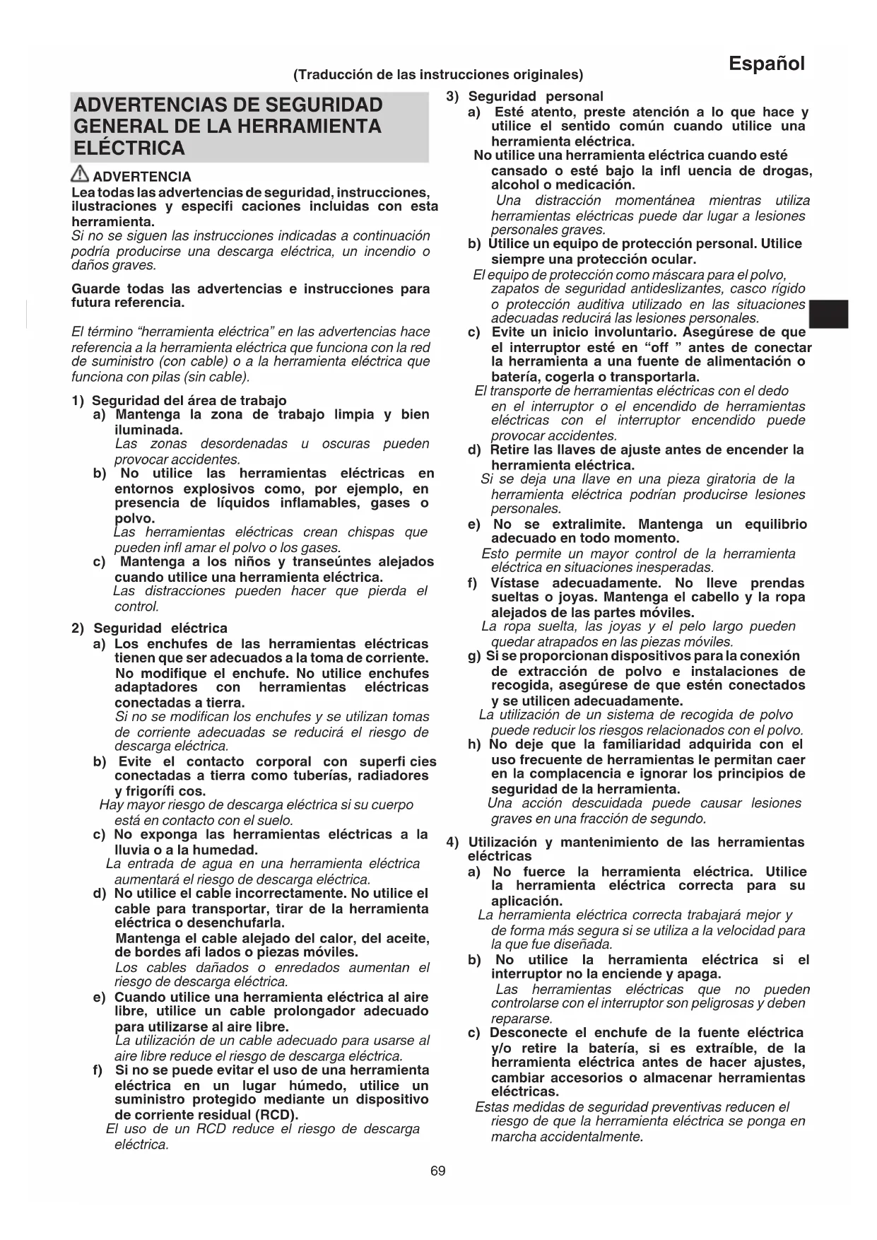 ELÉCTRICA ADVERTENCIA Lea todas las advertencias de seguridad, instrucciones, ilustraciones y especifi caciones incluidas con esta herramienta. Si no se siguen las instrucciones indicadas a continuación podría producirse una descarga eléctrica, un incendio o daños graves. Guarde todas las advertencias e instrucciones para futura referencia. El término “herramienta eléctrica” en las advertencias hace referencia a la herramienta eléctrica que funciona con la red de suministro (con cable) o a la herramienta eléctrica que funciona con pilas (sin cable).