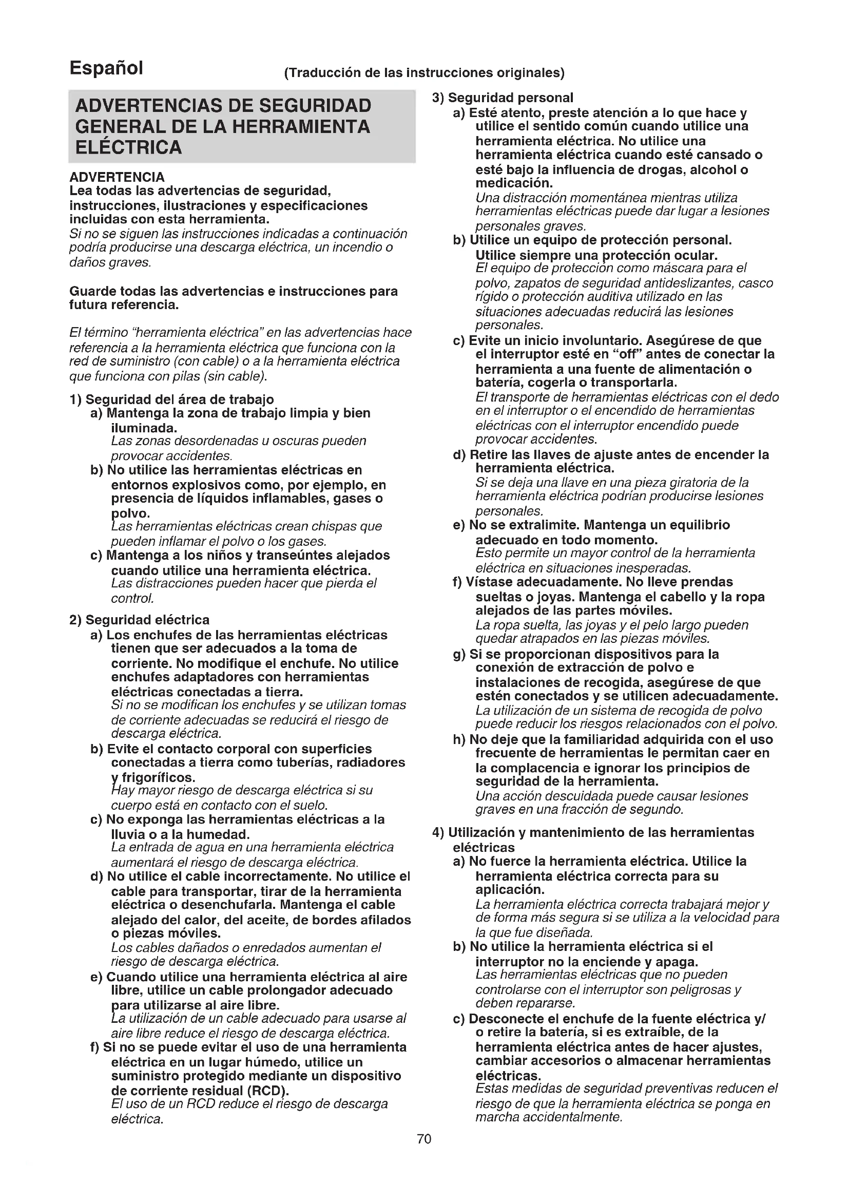 ELÉCTRICA ADVERTENCIA Lea todas las advertencias de seguridad, instrucciones, ilustraciones y especificaciones incluidas con esta herramienta. Si no se siguen las instrucciones indicadas a continuación podría producirse una descarga eléctrica, un incendio o daños graves. Guarde todas las advertencias e instrucciones para futura referencia. El término “herramienta eléctrica” en las advertencias hace referencia a la herramienta eléctrica que funciona con la red de suministro (con cable) o a la herramienta eléctrica que funciona con pilas (sin cable).