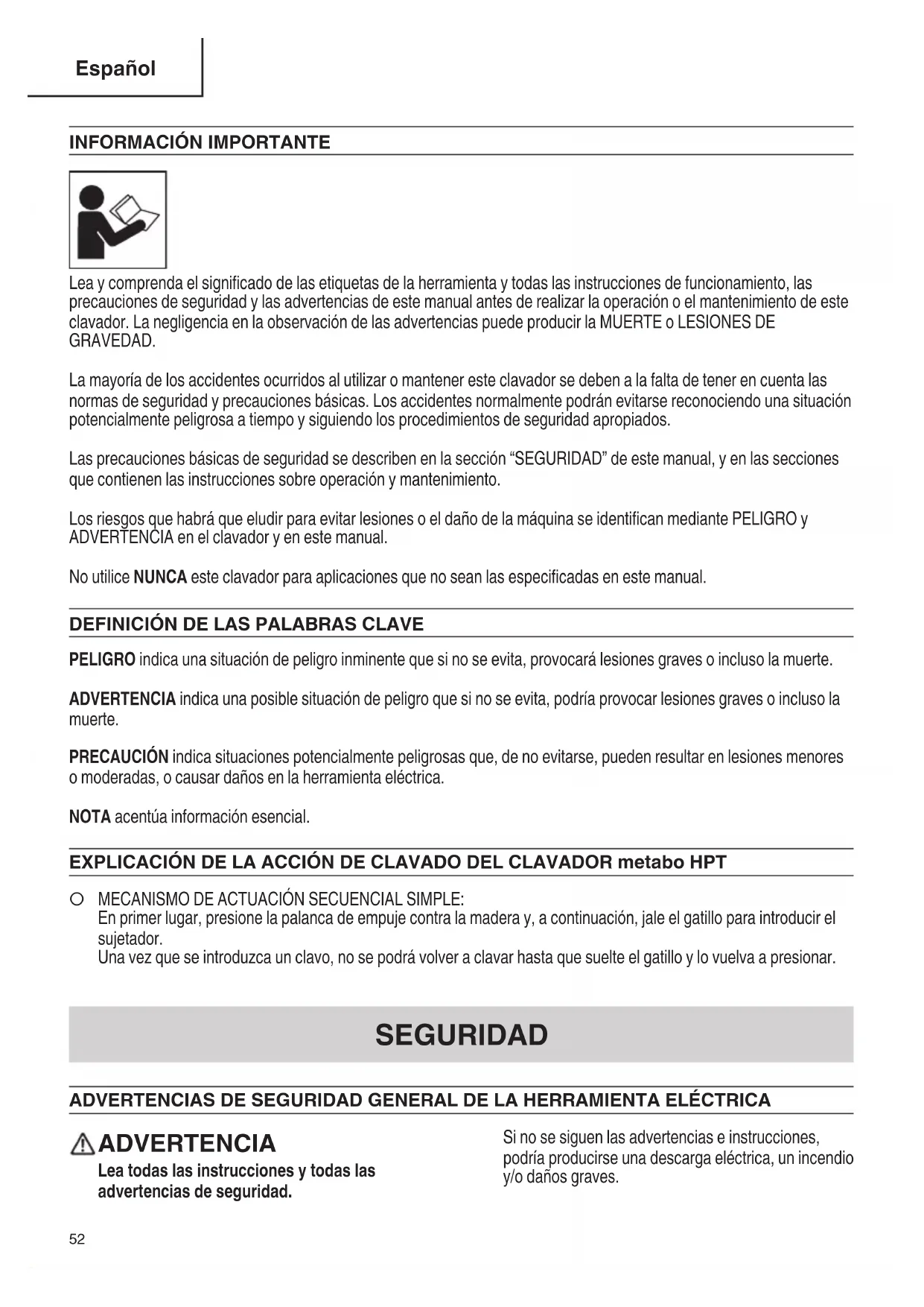 PELIGRO indica una situación de peligro inminente que si no se evita, provocará lesiones graves o incluso la muerte. ADVERTENCIA indica una posible situación de peligro que si no se evita, podría provocar lesiones graves o incluso la muerte. PRECAUCIÓN indica situaciones potencialmente peligrosas que, de no evitarse, pueden resultar en lesiones menores o moderadas, o causar daños en la herramienta eléctrica. NOTA acentúa información esencial. EXPLICACIÓN DE LA ACCIÓN DE CLAVADO DEL CLAVADOR metabo HPT