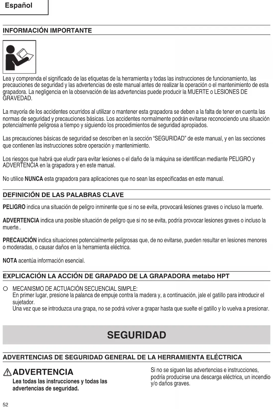 Lea y comprenda el significado de las etiquetas de la herramienta y todas las instrucciones de funcionamiento, las precauciones de seguridad y las advertencias de este manual antes de realizar la operación o el mantenimiento de esta grapadora. La negligencia en la observación de las advertencias puede producir la MUERTE o LESIONES DE GRAVEDAD. La mayoría de los accidentes ocurridos al utilizar o mantener esta grapadora se deben a la falta de tener en cuenta las normas de seguridad y precauciones básicas. Los accidentes normalmente podrán evitarse reconociendo una situación potencialmente peligrosa a tiempo y siguiendo los procedimientos de seguridad apropiados. Las precauciones básicas de seguridad se describen en la sección “SEGURIDAD” de este manual, y en las secciones que contienen las instrucciones sobre operación y mantenimiento. Los riesgos que habrá que eludir para evitar lesiones o el daño de la máquina se identifican mediante PELIGRO y ADVERTENCIA en la grapadora y en este manual. No utilice NUNCA esta grapadora para aplicaciones que no sean las especificadas en este manual.