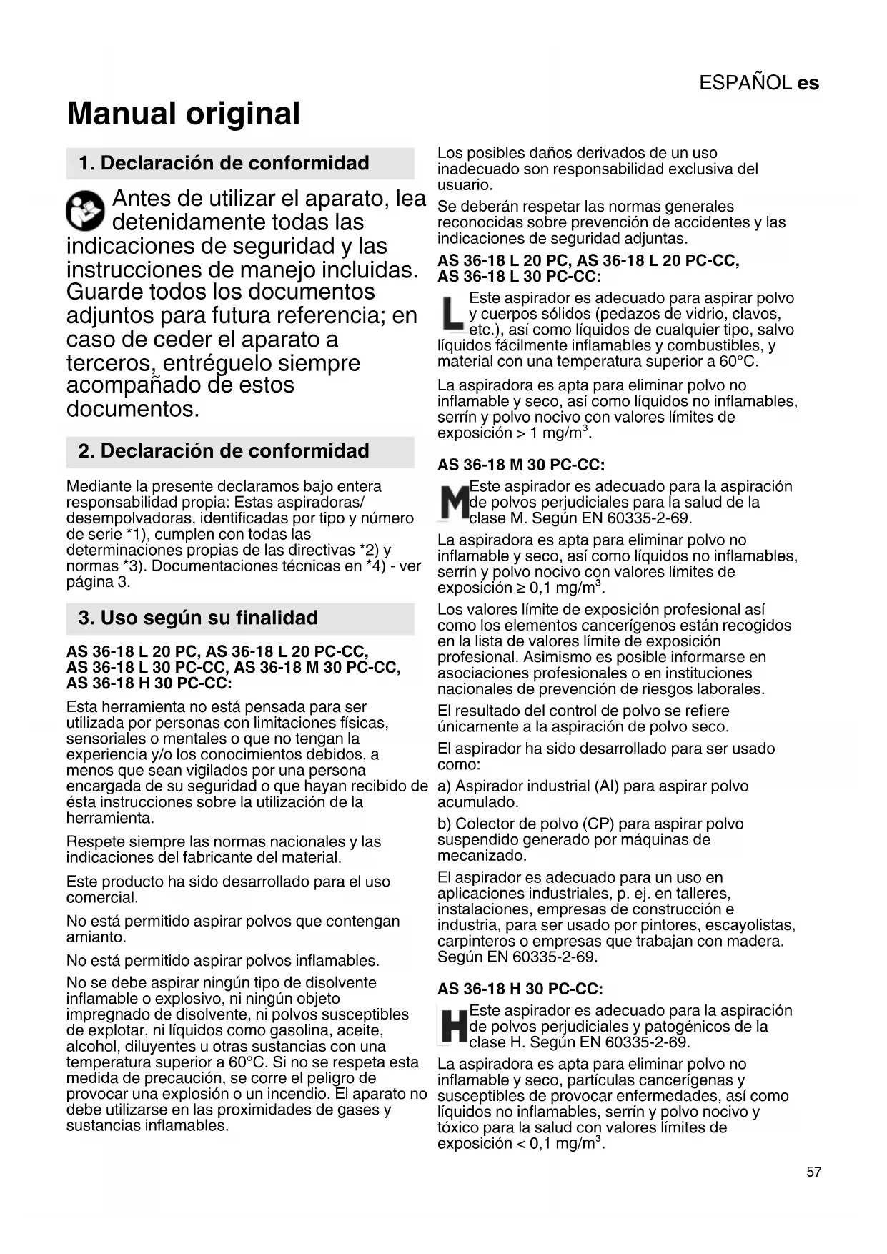 Manual original Antes de utilizar el aparato, lea detenidamente todas las indicaciones de seguridad y las instrucciones de manejo incluidas. Guarde todos los documentos adjuntos para futura referencia; en caso de ceder el aparato a terceros, entréguelo siempre acompañado de estos documentos. Mediante la presente declaramos bajo entera responsabilidad propia: Estas aspiradoras/ desempolvadoras, identificadas por tipo y número de serie *1), cumplen con todas las determinaciones propias de las directivas *2) y normas *3). Documentaciones técnicas en *4) - ver página 3. AS 36-18 L 20 PC, AS 36-18 L 20 PC-CC, AS 36-18 L 30 PC-CC, AS 36-18 M 30 PC-CC, AS 36-18 H 30 PC-CC: Esta herramienta no está pensada para ser utilizada por personas con limitaciones físicas, sensoriales o mentales o que no tengan la experiencia y/o los conocimientos debidos, a menos que sean vigilados por una persona encargada de su seguridad o que hayan recibido de ésta instrucciones sobre la utilización de la herramienta. Respete siempre las normas nacionales y las indicaciones del fabricante del material. Este producto ha sido desarrollado para el uso comercial. No está permitido aspirar polvos que contengan amianto. No está permitido aspirar polvos inflamables. No se debe aspirar ningún tipo de disolvente inflamable o explosivo, ni ningún objeto impregnado de disolvente, ni polvos susceptibles de explotar, ni líquidos como gasolina, aceite, alcohol, diluyentes u otras sustancias con una temperatura superior a 60°C. Si no se respeta esta medida de precaución, se corre el peligro de provocar una explosión o un incendio. El aparato no debe utilizarse en las proximidades de gases y sustancias inflamables. Los posibles daños derivados de un uso inadecuado son responsabilidad exclusiva del usuario. Se deberán respetar las normas generales reconocidas sobre prevención de accidentes y las indicaciones de seguridad adjuntas. AS 36-18 L 20 PC, AS 36-18 L 20 PC-CC, AS 36-18 L 30 PC-CC: Este aspirador es adecuado para aspirar polvo y cuerpos sólidos (pedazos de vidrio, clavos, etc.), así como líquidos de cualquier tipo, salvo líquidos fácilmente inflamables y combustibles, y material con una temperatura superior a 60°C. La aspiradora es apta para eliminar polvo no inflamable y seco, así como líquidos no inflamables, serrín y polvo nocivo con valores límites de exposición > 1 mg/m³. AS 36-18 M 30 PC-CC: Este aspirador es adecuado para la aspiración de polvos perjudiciales para la salud de la clase M. Según EN 60335-2-69. La aspiradora es apta para eliminar polvo no inflamable y seco, así como líquidos no inflamables, serrín y polvo nocivo con valores límites de exposición ≥ 0,1 mg/m³. Los valores límite de exposición profesional así como los elementos cancerígenos están recogidos en la lista de valores límite de exposición profesional. Asimismo es posible informarse en asociaciones profesionales o en instituciones nacionales de prevención de riesgos laborales. El resultado del control de polvo se refiere únicamente a la aspiración de polvo seco. El aspirador ha sido desarrollado para ser usado como: a) Aspirador industrial (AI) para aspirar polvo acumulado. b) Colector de polvo (CP) para aspirar polvo suspendido generado por máquinas de mecanizado. El aspirador es adecuado para un uso en aplicaciones industriales, p. ej. en talleres, instalaciones, empresas de construcción e industria, para ser usado por pintores, escayolistas, carpinteros o empresas que trabajan con madera. Según EN 60335-2-69. AS 36-18 H 30 PC-CC: Este aspirador es adecuado para la aspiración de polvos perjudiciales y patogénicos de la clase H. Según EN 60335-2-69. La aspiradora es apta para eliminar polvo no inflamable y seco, partículas cancerígenas y susceptibles de provocar enfermedades, así como líquidos no inflamables, serrín y polvo nocivo y tóxico para la salud con valores límites de exposición < 0,1 mg/m³.
