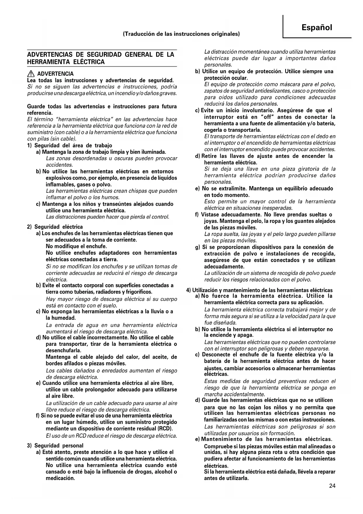 ADVERTENCIA Lea todas las instrucciones y advertencias de seguridad. Si no se siguen las advertencias e instrucciones, podría producirse una descarga eléctrica, un incendio y/o daños graves. Guarde todas las advertencias e instrucciones para futura referencia. El término “herramienta eléctrica” en las advertencias hace referencia a la herramienta eléctrica que funciona con la red de suministro (con cable) o a la herramienta eléctrica que funciona con pilas (sin cable).