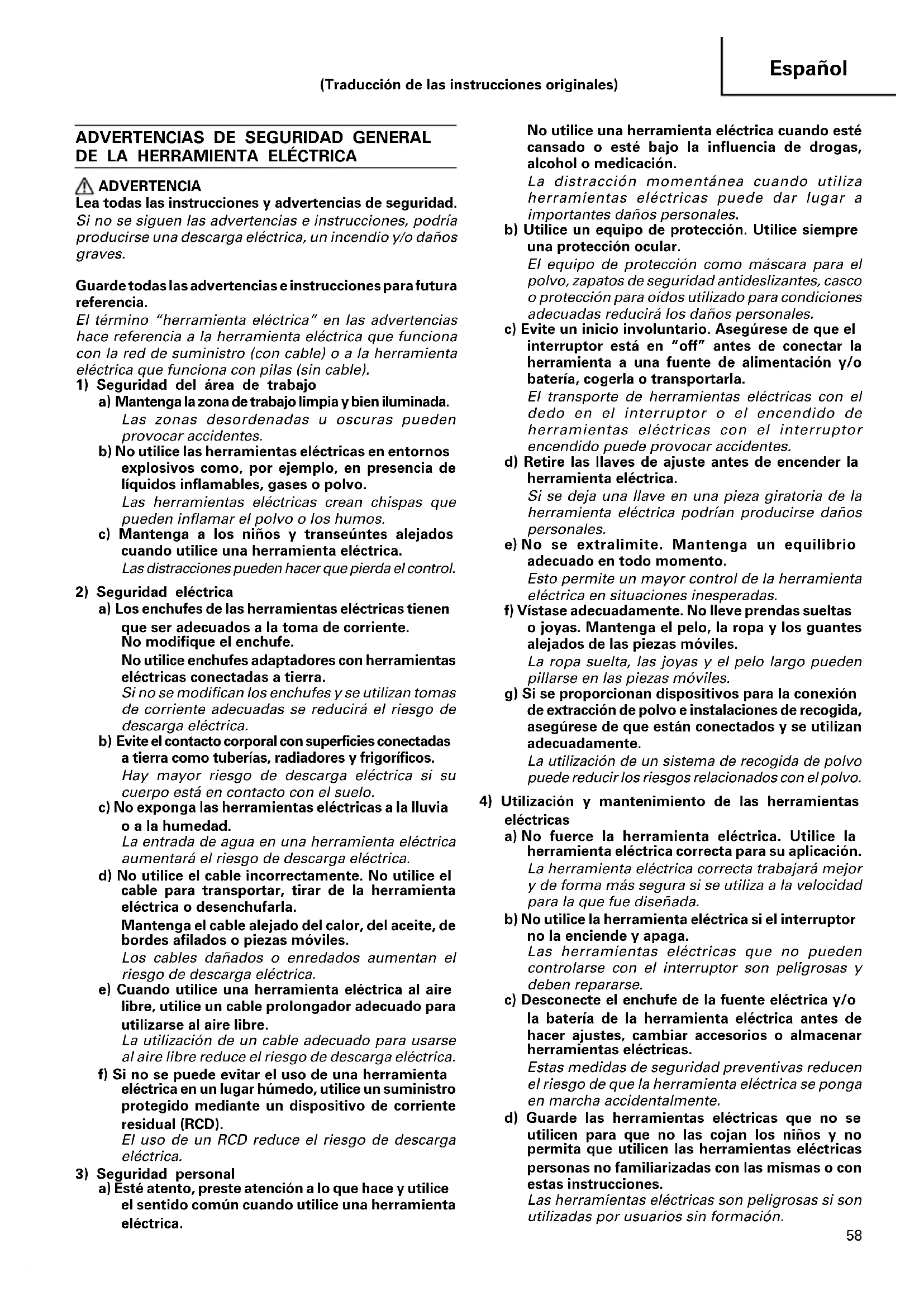 ADVERTENCIA Lea todas las instrucciones y advertencias de seguridad. Si no se siguen las advertencias e instrucciones, podría producirse una descarga eléctrica, un incendio y/o daños graves. Guarde todas las advertencias e instrucciones para futura referencia. El término “herramienta eléctrica” en las advertencias hace referencia a la herramienta eléctrica que funciona con la red de suministro (con cable) o a la herramienta eléctrica que funciona con pilas (sin cable).