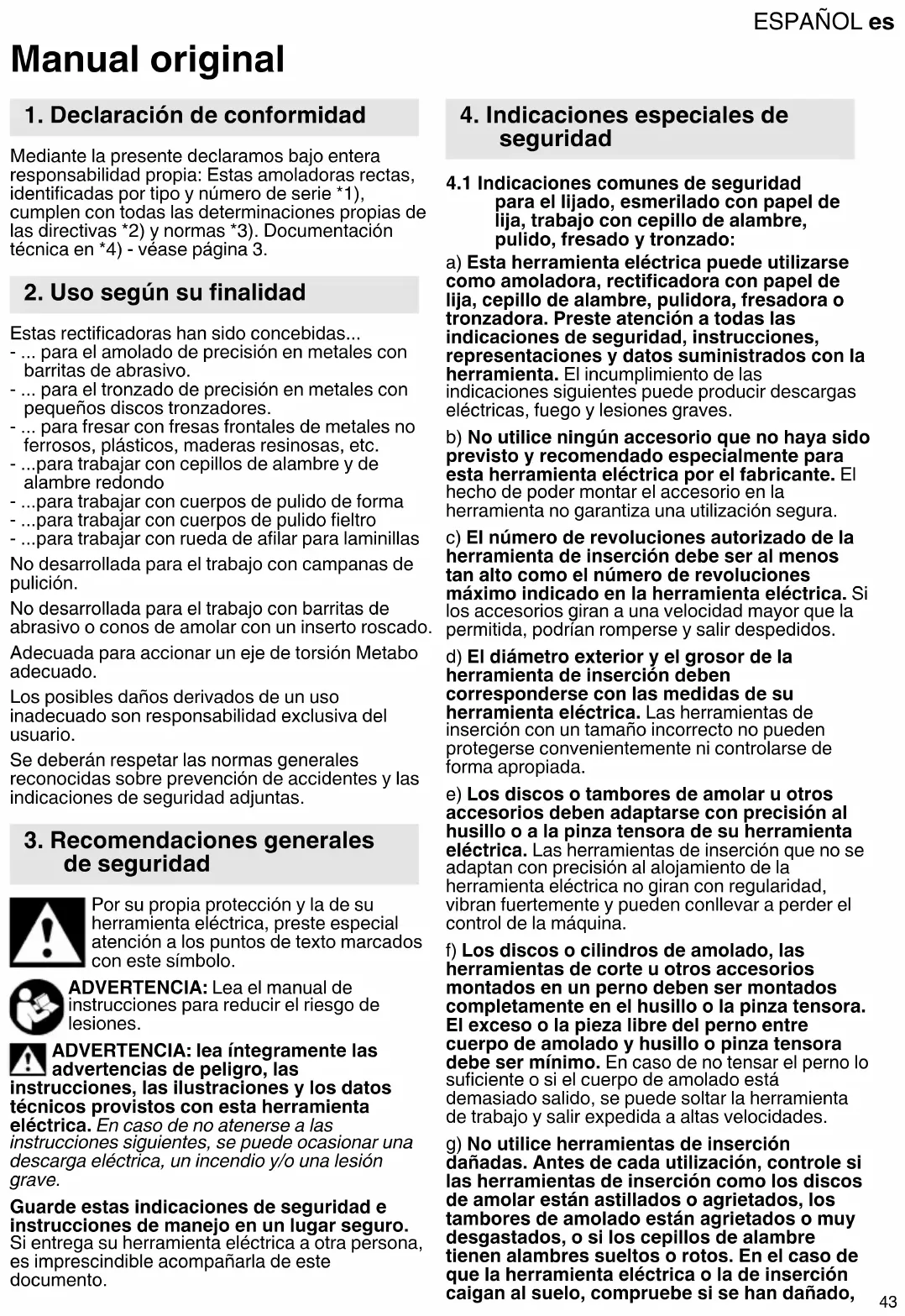 Manual original Mediante la presente declaramos bajo entera responsabilidad propia: Estas amoladoras rectas, identificadas por tipo y número de serie *1), cumplen con todas las determinaciones propias de las directivas *2) y normas *3). Documentación técnica en *4) - véase página 3. Estas rectificadoras han sido concebidas... - ... para el amolado de precisión en metales con barritas de abrasivo. - ... para el tronzado de precisión en metales con pequeños discos tronzadores. - ... para fresar con fresas frontales de metales no ferrosos, plásticos, maderas resinosas, etc. - ...para trabajar con cepillos de alambre y de alambre redondo - ...para trabajar con cuerpos de pulido de forma - ...para trabajar con cuerpos de pulido fieltro - ...para trabajar con rueda de afilar para laminillas No desarrollada para el trabajo con campanas de pulición. No desarrollada para el trabajo con barritas de abrasivo o conos de amolar con un inserto roscado. Adecuada para accionar un eje de torsión Metabo adecuado. Los posibles daños derivados de un uso inadecuado son responsabilidad exclusiva del usuario. Se deberán respetar las normas generales reconocidas sobre prevención de accidentes y las indicaciones de seguridad adjuntas. Por su propia protección y la de su herramienta eléctrica, preste especial atención a los puntos de texto marcados con este símbolo. ADVERTENCIA: Lea el manual de instrucciones para reducir el riesgo de lesiones. ADVERTENCIA: lea íntegramente las advertencias de peligro, las instrucciones, las ilustraciones y los datos técnicos provistos con esta herramienta eléctrica. En caso de no atenerse a las instrucciones siguientes, se puede ocasionar una descarga eléctrica, un incendio y/o una lesión grave. Guarde estas indicaciones de seguridad e instrucciones de manejo en un lugar seguro. Si entrega su herramienta eléctrica a otra persona, es imprescindible acompañarla de este documento.