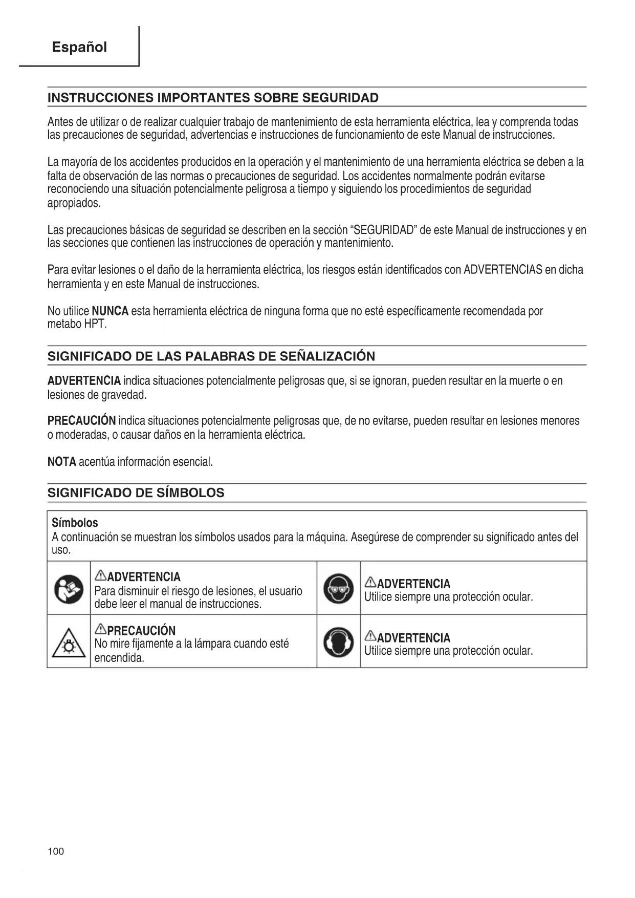 Antes de utilizar o de realizar cualquier trabajo de mantenimiento de esta herramienta eléctrica, lea y comprenda todas las precauciones de seguridad, advertencias e instrucciones de funcionamiento de este Manual de instrucciones. La mayoría de los accidentes producidos en la operación y el mantenimiento de una herramienta eléctrica se deben a la falta de observación de las normas o precauciones de seguridad. Los accidentes normalmente podrán evitarse reconociendo una situación potencialmente peligrosa a tiempo y siguiendo los procedimientos de seguridad apropiados. Las precauciones básicas de seguridad se describen en la sección “SEGURIDAD” de este Manual de instrucciones y en las secciones que contienen las instrucciones de operación y mantenimiento. Para evitar lesiones o el daño de la herramienta eléctrica, los riesgos están identificados con ADVERTENCIAS en dicha herramienta y en este Manual de instrucciones. No utilice NUNCA esta herramienta eléctrica de ninguna forma que no esté específicamente recomendada por metaboHPT. SIGNIFICADO DE LAS PALABRAS DE SEÑALIZACIÓN ADVERTENCIA indica situaciones potencialmente peligrosas que, si se ignoran, pueden resultar en la muerte o en lesiones de gravedad. PRECAUCIÓN indica situaciones potencialmente peligrosas que, de no evitarse, pueden resultar en lesiones menores o moderadas, o causar daños en la herramienta eléctrica. NOTA acentúa información esencial.