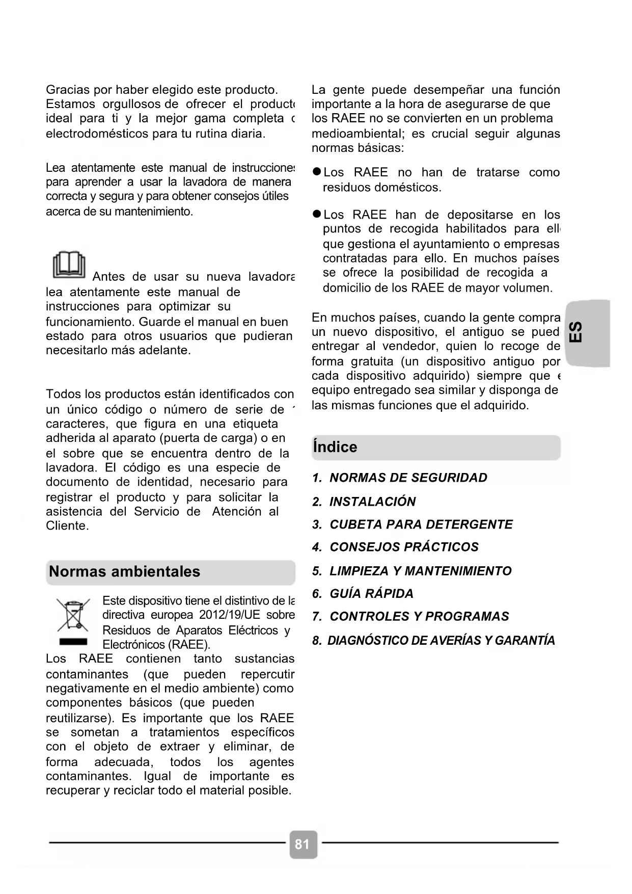 Gracias por haber elegido este producto. Estamos orgullosos de ofrecer el producto ideal para ti y la mejor gama completa de electrodomésticos para tu rutina diaria. Lea atentamente este manual de instrucciones para aprender a usar la lavadora de manera correcta y segura y para obtener consejos útiles acerca de su mantenimiento. Antes de usar su nueva lavadora, lea atentamente este manual de instrucciones para optimizar su funcionamiento. Guarde el manual en buen estado para otros usuarios que pudieran necesitarlo más adelante. Todos los productos están identificados con un único código o número de serie de 16 caracteres, que figura en una etiqueta adherida al aparato (puerta de carga) o en el sobre que se encuentra dentro de la lavadora. El código es una especie de documento de identidad, necesario para registrar el producto y para solicitar la asistencia del Servicio de Atención al Cliente.
