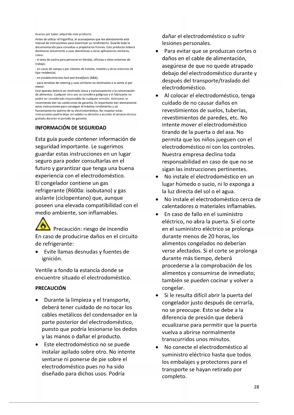 Esta guía puede contener información de seguridad importante. Le sugerimos guardar estas instrucciones en un lugar seguro para poder consultarlas en el futuro y garantizar que tenga una buena experiencia con el electrodoméstico. El congelador contiene un gas refrigerante (R600a: isobutano) y gas aislante (ciclopentano) que, aunque poseen una elevada compatibilidad con el medio ambiente, son inflamables. Precaución: riesgo de incendio En caso de producirse daños en el circuito de refrigerante: