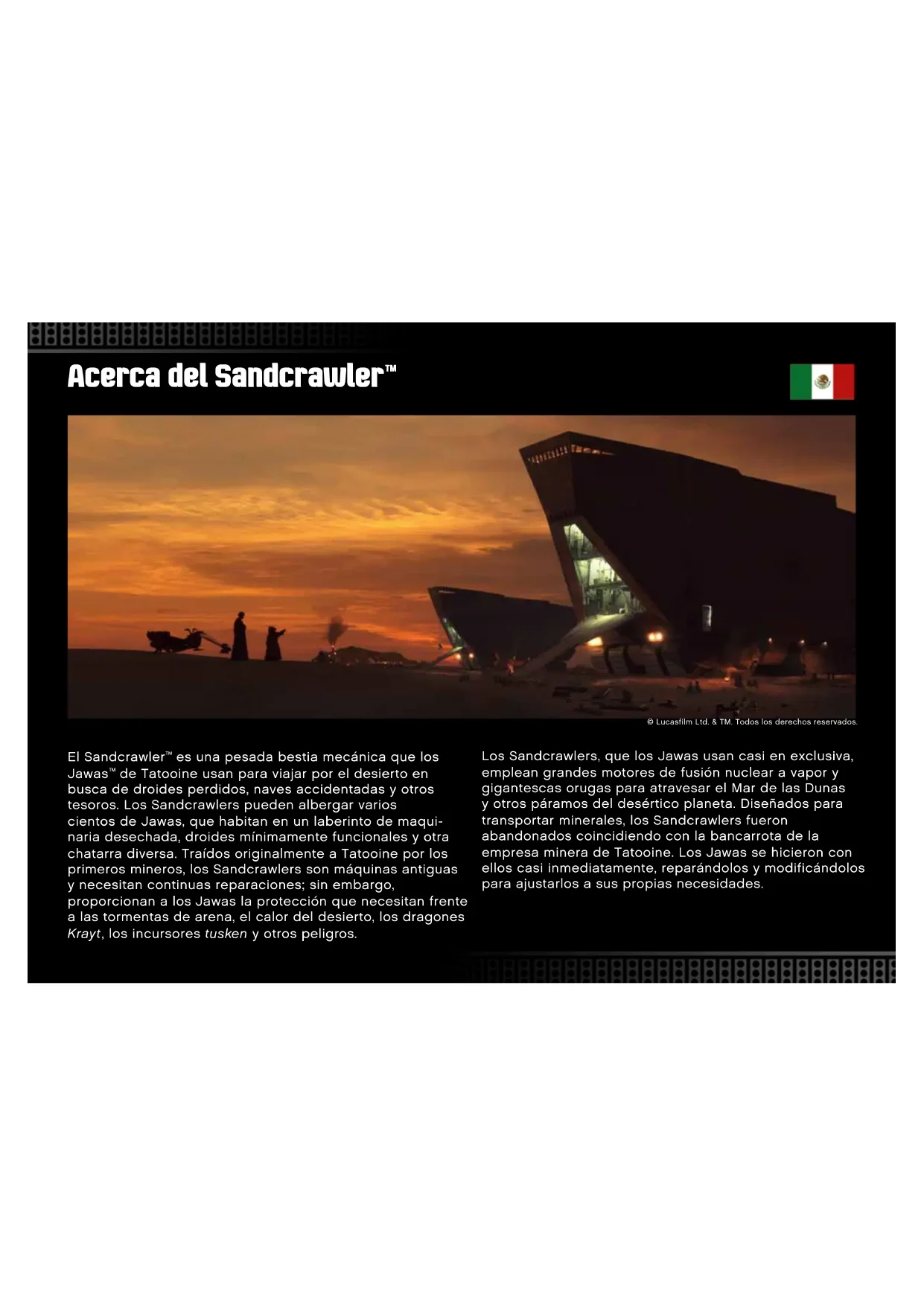 es un set exclusivo y asombroso. Fue un duro trabajo determinar cómo sería finalmente, y qué tendría sentido y qué no. Llevamos a cabo muchas lluvias de ideas sobre eso, y acabamos decidiéndonos por este modelo, del que estoy muy orgulloso. P: Habiendo tantos modelos LEGO Star Wars, ¿en qué crees que se diferencia el Sandcrawler de LEGO de los demás? R: En que no compromete ningún aspecto. Hemos hecho todo lo posible por hacer de este un set verdaderamente definitivo. © Lucasfilm Ltd. & TM. Todos los derechos reservados.21