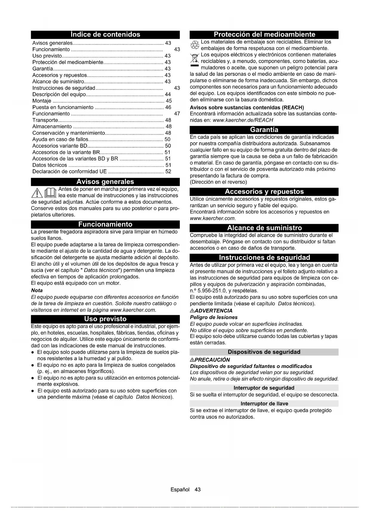 - dB(A)81818181Español 43 Índice de contenidos Avisos generales Antes de poner en marcha por primera vez el equipo, lea este manual de instrucciones y las instrucciones de seguridad adjuntas. Actúe conforme a estos documentos. Conserve estos dos manuales para su uso posterior o para pro- pietarios ulteriores. Funcionamiento La presente fregadora aspiradora sirve para limpiar en húmedo suelos llanos. El equipo puede adaptarse a la tarea de limpieza correspondien- te mediante el ajuste de la cantidad de agua y detergente. La do- sificación del detergente se ajusta mediante adición al depósito. El ancho útil y el volumen útil de los depósitos de agua fresca y sucia (ver el capítulo " Datos técnicos") permiten una limpieza efectiva en tiempos de aplicación prolongados. El equipo está equipado con un motor. Nota El equipo puede equiparse con diferentes accesorios en función de la tarea de limpieza en cuestión. Solicite nuestro catálogo o visítenos en internet en la página www.kaercher.com. Uso previsto Este equipo es apto para el uso profesional e industrial, por ejem- plo, en hoteles, escuelas, hospitales, fábricas, tiendas, oficinas y negocios de alquiler. Utilice este equipo únicamente de conformi- dad con las indicaciones de este manual de instrucciones. ● El equipo solo puede utilizarse para la limpieza de suelos pla- nos resistentes a la humedad y al pulido. ● El equipo no es apto para la limpieza de suelos congelados (p. ej., en almacenes frigoríficos). ● El equipo no es apto para su utilización en entornos potencial- mente explosivos. ● El equipo está autorizado para su uso sobre superficies con una pendiente máxima (véase el capítulo Datos técnicos). Protección del medioambiente Los materiales de embalaje son reciclables. Eliminar los embalajes de forma respetuosa con el medioambiente. Los equipos eléctricos y electrónicos contienen materiales reciclables y, a menudo, componentes, como baterías, acu- muladores o aceite, que suponen un peligro potencial para la salud de las personas o el medio ambiente en caso de mani- pularse o eliminarse de forma inadecuada. Sin embargo, dichos componentes son necesarios para un funcionamiento adecuado del equipo. Los equipos identificados con este símbolo no pue- den eliminarse con la basura doméstica. Avisos sobre sustancias contenidas (REACH) Encontrará información actualizada sobre las sustancias conte- nidas en: www.kaercher.de/REACH Garantía En cada país se aplican las condiciones de garantía indicadas por nuestra compañía distribuidora autorizada. Subsanamos cualquier fallo en su equipo de forma gratuita dentro del plazo de garantía siempre que la causa se deba a un fallo de fabricación o material. En caso de garantía, póngase en contacto con su dis- tribuidor o con el servicio de posventa autorizado más próximo presentando la factura de compra. (Dirección en el reverso) Accesorios y repuestos Utilice únicamente accesorios y repuestos originales, estos ga- rantizan un servicio seguro y fiable del equipo. Encontrará información sobre los accesorios y repuestos en www.kaercher.com. Alcance de suministro Compruebe la integridad del alcance de suministro durante el desembalaje. Póngase en contacto con su distribuidor si faltan accesorios o en caso de daños de transporte. Instrucciones de seguridad Antes de utilizar por primera vez el equipo, lea y tenga en cuenta el presente manual de instrucciones y el folleto adjunto relativo a las instrucciones de seguridad para equipos de limpieza con ce- pillos y equipos de pulverización y aspiración combinadas, n.º 5.956-251.0, y respételas. El equipo está autorizado para su uso sobre superficies con una pendiente limitada (véase el capítulo Datos técnicos). 몇 ADVERTENCIA Peligro de lesiones El equipo puede volcar en superficies inclinadas. No utilice el equipo sobre superficies en pendiente. El equipo solo debe utilizarse cuando todas las cubiertas y tapas están cerradas. Dispositivos de seguridad 몇 PRECAUCIÓN Dispositivo de seguridad faltantes o modificados Los dispositivos de seguridad velan por su seguridad. No anule, retire o deje sin efecto ningún dispositivo de seguridad. Interruptor de seguridad Si se suelta el interruptor de seguridad, el equipo se desconecta. Interruptor de llave Si se extrae el interruptor de llave, el equipo queda protegido contra usos no autorizados. Avisos generales p. 43