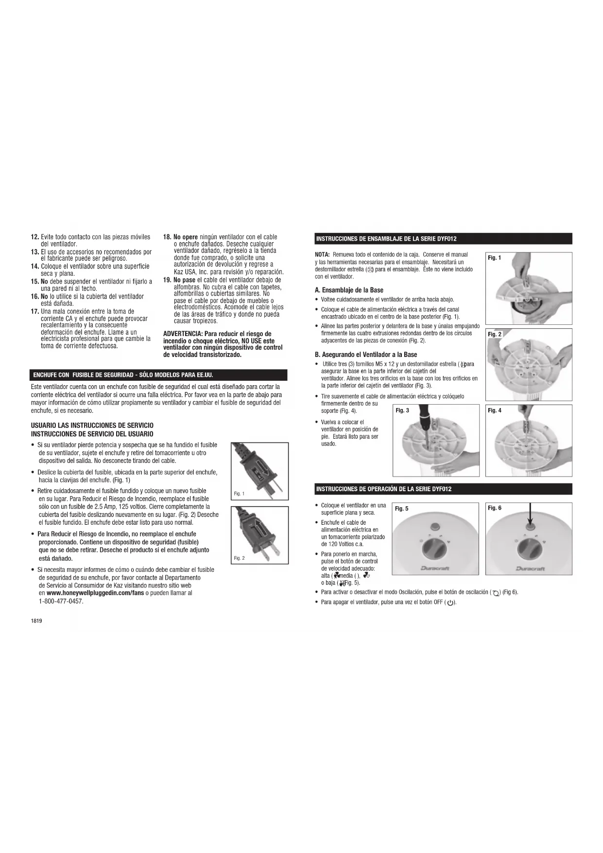 - Vuelva a colocar el ventilador en posición de pie. Estará listo para ser usado. INSTRUCCIONES DE ENSAMBLAJE DE LA SERIE DYF012 ENCHUFE CON FUSIBLE DE SEGURIDAD - SÓLO MODELOS PARA EE.UU. INSTRUCCIONES DE OPERACIÓN DE LA SERIE DYF012