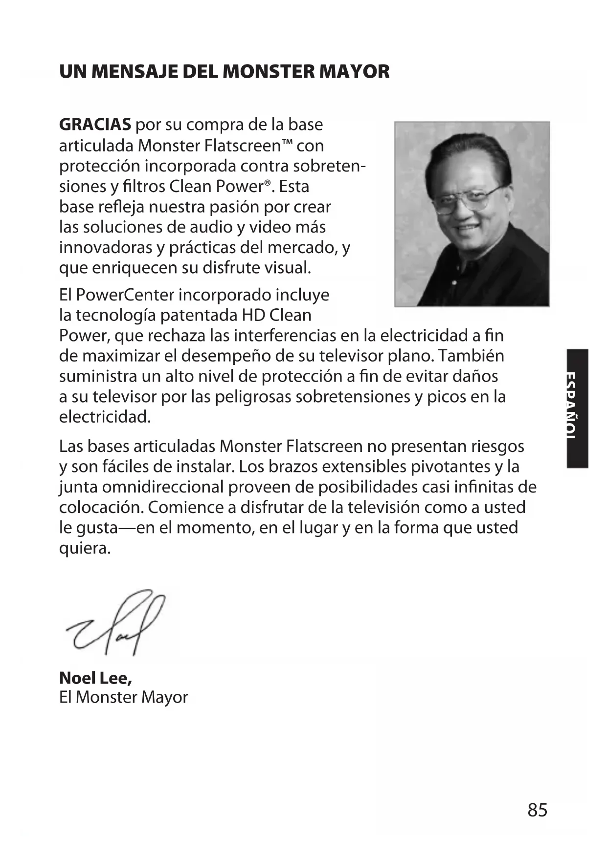 GRACIAS por su compra de la base articulada Monster Flatscreen™ con protección incorporada contra sobreten- siones y ltros Clean Power®. Esta base reeja nuestra pasión por crear las soluciones de audio y video más innovadoras y prácticas del mercado, y que enriquecen su disfrute visual. El PowerCenter incorporado incluye la tecnología patentada HD Clean Power, que rechaza las interferencias en la electricidad a n de maximizar el desempeño de su televisor plano. También suministra un alto nivel de protección a n de evitar daños a su televisor por las peligrosas sobretensiones y picos en la electricidad. Las bases articuladas Monster Flatscreen no presentan riesgos y son fáciles de instalar. Los brazos extensibles pivotantes y la junta omnidireccional proveen de posibilidades casi innitas de colocación. Comience a disfrutar de la televisión como a usted le gusta—en el momento, en el lugar y en la forma que usted quiera. Noel Lee, El Monster MayorESPAÑOL