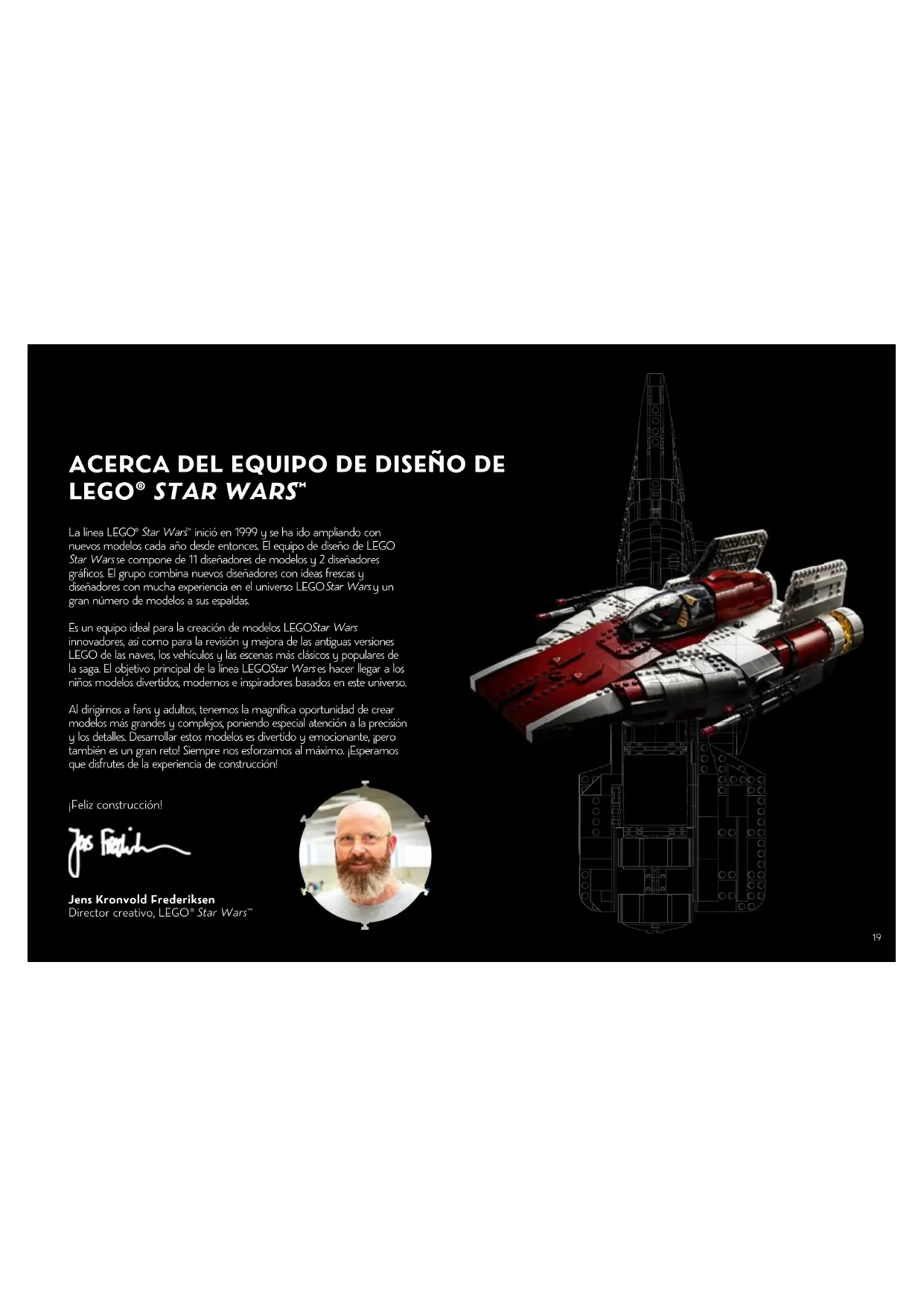 inició en 1999 y se ha ido ampliando con nuevos modelos cada año desde entonces. El equipo de diseño de LEGO Star Wars se compone de 11 diseñadores de modelos y 2 diseñadores gráficos. El grupo combina nuevos diseñadores con ideas frescas y diseñadores con mucha experiencia en el universo LEGO Star Wars y un gran número de modelos a sus espaldas. Es un equipo ideal para la creación de modelos LEGO Star Wars innovadores, así como para la revisión y mejora de las antiguas versiones LEGO de las naves, los vehículos y las escenas más clásicos y populares de la saga. El objetivo principal de la línea LEGO Star Wars es hacer llegar a los niños modelos divertidos, modernos e inspiradores basados en este universo. Al dirigirnos a fans y adultos, tenemos la magnífica oportunidad de crear modelos más grandes y complejos, poniendo especial atención a la precisión y los detalles. Desarrollar estos modelos es divertido y emocionante, ¡pero también es un gran reto! Siempre nos esforzamos al máximo. ¡Esperamos que disfrutes de la experiencia de construcción! ¡Feliz construcción! Jens Kronvold Frederiksen Director creativo, LEGO