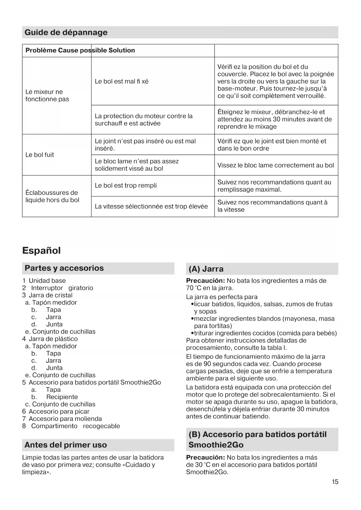 - Para alimentos blandos o pastosos, comience con la velocidad I durante los primeros segundos y luego cambie a la velocidad II para seguir procesando. (E) Cuidado y limpieza Para obtener información detallada, consulte la sección E. Garantía y servicio Para obtener información detallada, consulte el cuaderno de la garantía y el servicio o visite www.braunhousehold.com. Guía de resolución de problemas Problema Posible causa Solución La batidora de vaso no funciona La jarra no está colocada correctamente Compruebe la posición de la jarra y de la tapa. Coloque la jarra con el asa a la derecha o a la izquierda en el cuerpo del motor. Luego gírela hasta que esté completamente bloqueada. La protección contra el sobrecalentamiento del motor se activa Apague la batidora de vaso, desenchúfela y espere al menos 30 minutos antes de continuar batiendo La jarra gotea La junta o está insertada o está mal colocada. Compruebe si la junta está montada correctamente y en el orden correcto El conjunto de la cuchilla no está bien atornillado a la jarra Atornille el conjunto de la cuchilla correctamente a la jarra Salpica líquido de la jarra La jarra está demasiado llena Compruebe la máxima recomendación de cantidad La velocidad seleccionada es demasiado alta Consulte la recomendación de velocidad 5722310505_UI_JB_1xxx_INT.indd 165722310505_UI_JB_1xxx_INT.indd 16 13.01.22 14:1413.01.22 14:1417 Português Peças e acessórios 1 Unidade da base 2 Interruptor rotativo 3 Jarro de vidro a. tampa de medição b. tampa c. jarro d. vedação e. grupo da lâmina 4 Jarro de plástico a. tampa de medição b. tampa c. jarro d. vedação e. grupo da lâmina 5 Acessório Smoothie2Go a. tampa b. frasco c. grupo da lâmina 6 Acessório para picar 7 Acessório para moer 8 Compartimento do cabo Antes da primeira utilização Limpe todas as peças antes de utilizar o liquidifi cador pela primeira vez – consulte «Cuidados e limpeza». (A) Jarro Atenção: Não misture ingredientes a uma temperatura superior a 70 °C no jarro. O jarro é perfeitamente adequado para