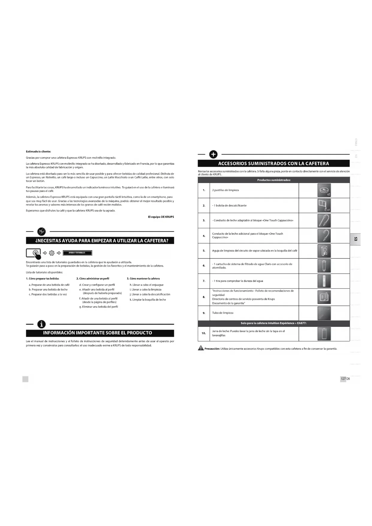 Estimado/a cliente: Gracias por comprar una cafetera Espresso KRUPS con molinillo integrado. La cafetera Espresso KRUPS con molinillo integrado se ha diseñado, desarrollado y fabricado en Francia, por lo que garantiza la más absoluta calidad de fabricación y origen. La cafetera está diseñada para ser lo más sencilla de usar posible y para ofrecer bebidas de calidad profesional. Disfruta de un Espresso, un Ristretto, un café largo o incluso un Capuccino, un Latte Macchiato o un Caé Latte, entre otros, con solo tocar un botón. Para facilitarte las cosas, KRUPS ha desarrollado un indicador luminoso intuitivo. Te guiará en el uso de la cafetera e iluminará tus pausas para el café. Además, la cafetera Espresso KRUPS está equipada con una gran pantalla táctil intuitiva, como la de un smartphone, para que sea muy fácil de usar. Gracias a las tecnologías avanzadas de la máquina, podrás obtener el mejor resultado posible y revelar los aromas y sabores más intensos de los granos de café recién molidos. Esperamos que disfrutes tu café y que la cafetera KRUPS sea de tu agrado. El equipo DE KRUPS ¿NECESITAS AYUDA PARA EMPEZAR A UTILIZAR LA CAFETERA?