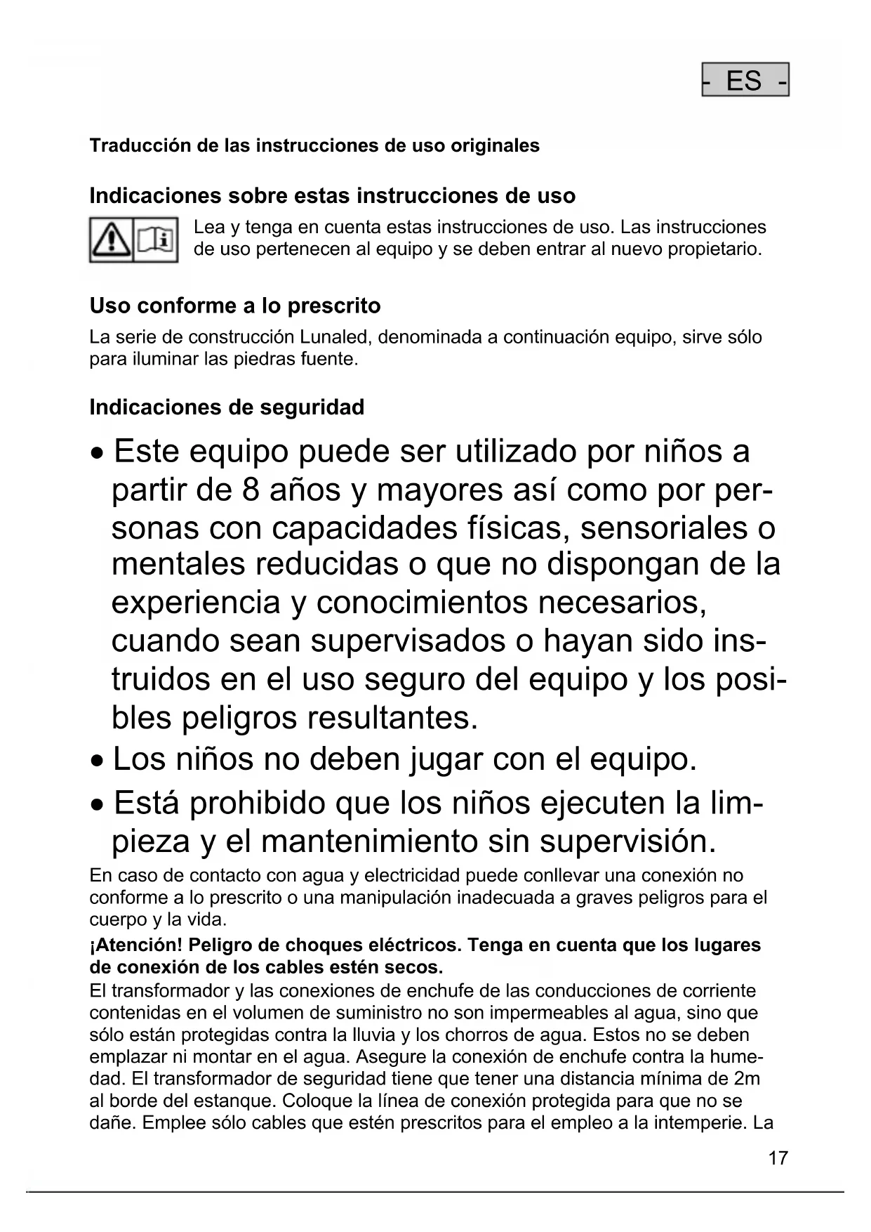 Uso conforme a lo prescrito La serie de construcción Lunaled, denominada a continuación equipo, sirve sólo para iluminar las piedras fuente.