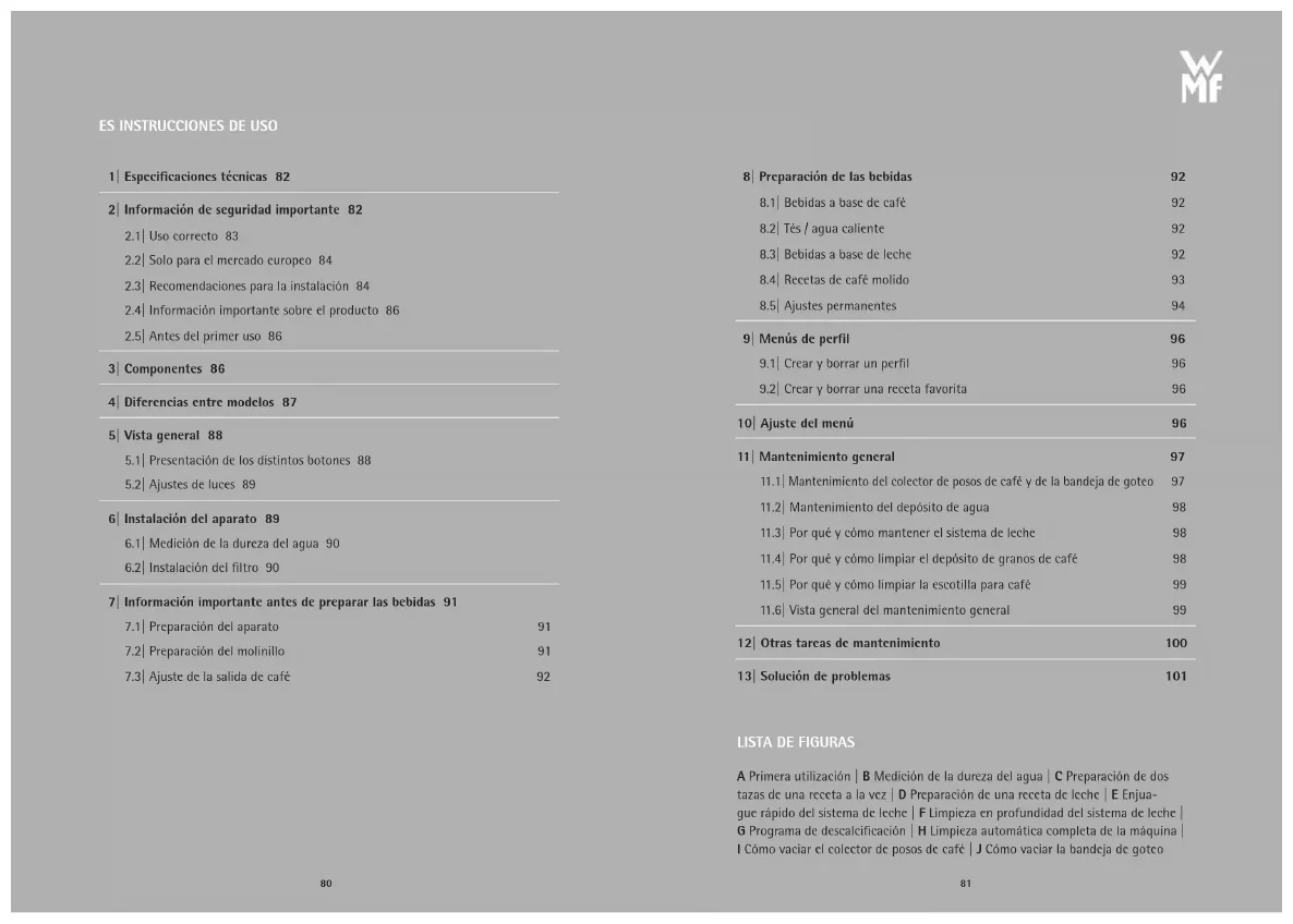A Primera utilización | B Medición de la dureza del agua | C Preparación de dos tazas de una receta a la vez | D Preparación de una receta de leche | E Enjua- gue rápido del sistema de leche | F Limpieza en profundidad del sistema de leche | GPrograma de descalcificación | H Limpieza automática completa de la máquina | I Cómo vaciar el colector de posos de café | J Cómo vaciar la bandeja de goteo