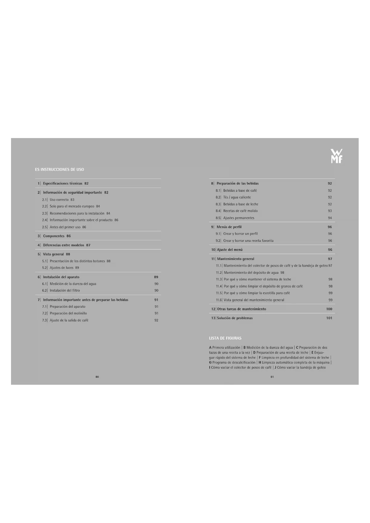 TR SV RU RO PT PL NO NL FI DA CS IT ES FR EN DEES INSTRUCCIONES DE USO 1| Especificaciones técnicas 82 2| Información de seguridad importante 82 2.1| Uso correcto 83 2.2| Solo para el mercado europeo 84 2.3| Recomendaciones para la instalación 84 2.4| Información importante sobre el producto 86 2.5| Antes del primer uso 86 3| Componentes 86 4| Diferencias entre modelos 87 5| Vista general 88 5.1| Presentación de los distintos botones 88 5.2| Ajustes de luces 89 6| Instalación del aparato 89 6.1| Medición de la dureza del agua 90 6.2| Instalación del filtro 90 7| Información importante antes de preparar las bebidas 91 7.1| Preparación del aparato 91 7.2| Preparación del molinillo 91 7.3| Ajuste de la salida de café 92 8| Preparación de las bebidas 92 8.1| Bebidas a base de café 92 8.2| Tés / agua caliente 92 8.3| Bebidas a base de leche 92 8.4| Recetas de café molido 93 8.5| Ajustes permanentes 94 9| Menús de perfil 96 9.1| Crear y borrar un perfil 96 9.2| Crear y borrar una receta favorita 96 10| Ajuste del menú 96 11| Mantenimiento general 97 11.1| Mantenimiento del colector de posos de café y de la bandeja de goteo 97 11.2| Mantenimiento del depósito de agua 98 11.3| Por qué y cómo mantener el sistema de leche 98 11.4| Por qué y cómo limpiar el depósito de granos de café 98 11.5| Por qué y cómo limpiar la escotilla para café 99 11.6| Vista general del mantenimiento general 99 12| Otras tareas de mantenimiento 100 13| Solución de problemas 101