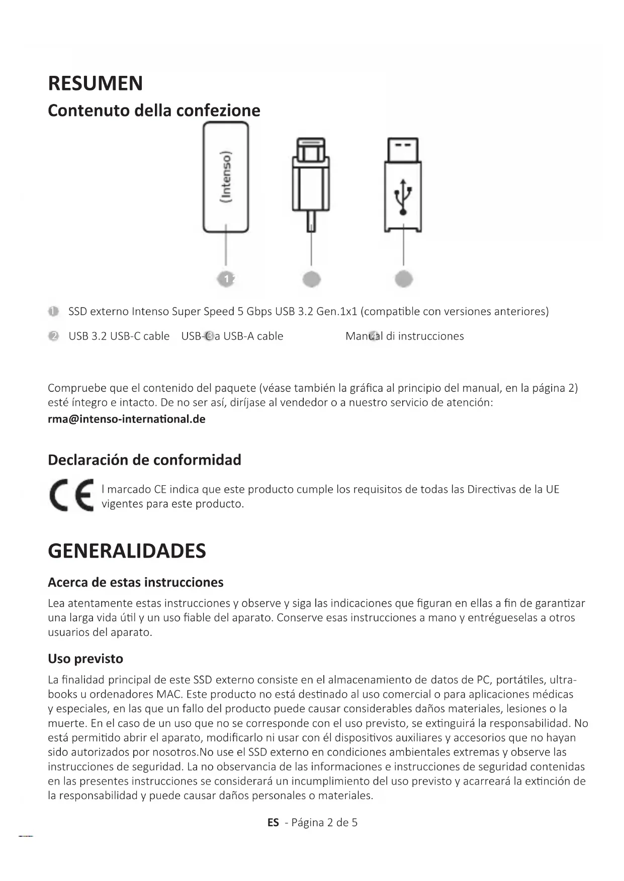 - Cláusula de exención de responsabilidad ES - Página 1 de 5RESUMEN Contenuto della confezione Compruebe que el contenido del paquete (véase también la gráca al principio del manual, en la página 2) esté íntegro e intacto. De no ser así, diríjase al vendedor o a nuestro servicio de atención: rma@intenso-internaonal.de Declaración de conformidad l marcado CE indica que este producto cumple los requisitos de todas las Direcvas de la UE vigentes para este producto. GENERALIDADES Acerca de estas instrucciones Lea atentamente estas instrucciones y observe y siga las indicaciones que guran en ellas a n de garanzar una larga vida úl y un uso able del aparato. Conserve esas instrucciones a mano y entrégueselas a otros usuarios del aparato. Uso previsto La nalidad principal de este SSD externo consiste en el almacenamiento de datos de PC, portáles, ultra- books u ordenadores MAC. Este producto no está desnado al uso comercial o para aplicaciones médicas y especiales, en las que un fallo del producto puede causar considerables daños materiales, lesiones o la muerte. En el caso de un uso que no se corresponde con el uso previsto, se exnguirá la responsabilidad. No está permido abrir el aparato, modicarlo ni usar con él disposivos auxiliares y accesorios que no hayan sido autorizados por nosotros.No use el SSD externo en condiciones ambientales extremas y observe las instrucciones de seguridad. La no observancia de las informaciones e instrucciones de seguridad contenidas en las presentes instrucciones se considerará un incumplimiento del uso previsto y acarreará la exnción de la responsabilidad y puede causar daños personales o materiales. ES - Página 2 de 5 SSD externo Intenso Super Speed 5 Gbps USB 3.2 Gen.1x1 (compable con versiones anteriores) USB 3.2 USB-C cable USB-C a USB-A cable Manual di instrucciones p. 5