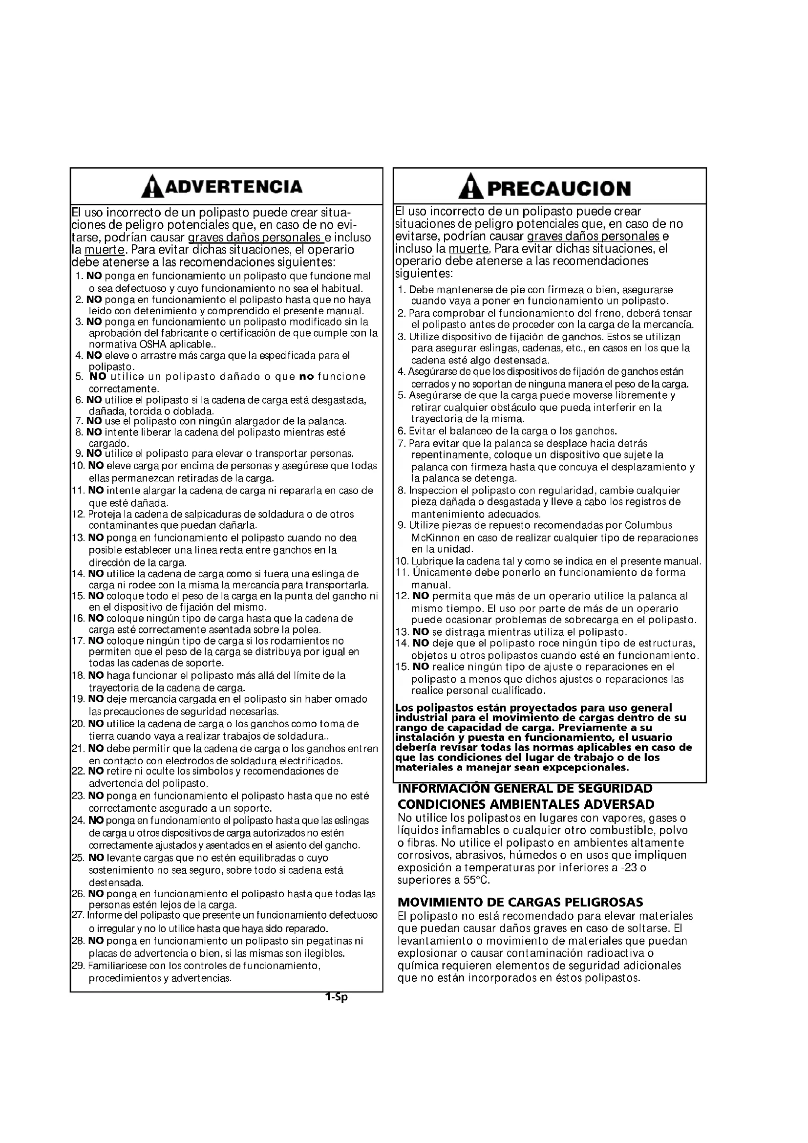 procedimientos y advertencias. El uso incorrecto de un polipasto puede crear situaciones de peligro potenciales que, en caso de no evitarse, podrían causar graves daños personales e incluso la muerte . Para evitar dichas situaciones, el operario debe atenerse a las recomendaciones siguientes: