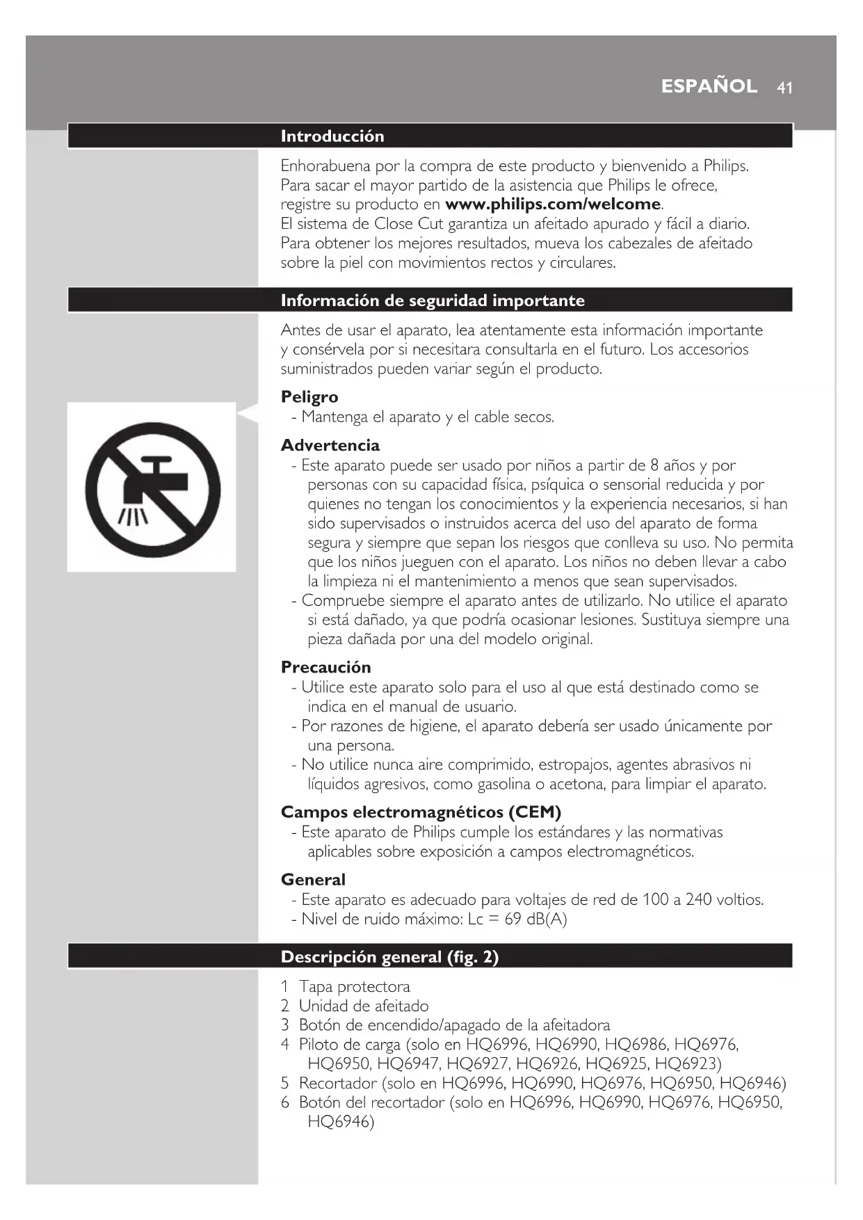 Το δέρμα σας θα χρειαστεί χρόνο για να συνηθίσει το σύστημα ξυρίσματος της Philips. Ο ερεθισμός του δέρματος κατά τη διάρκεια των πρώτων 2-3 εβδομάδων χρήσης είναι φυσιολογικός. Μετά από αυτό το χρονικό διάστημα, ο ερεθισμός του δέρματος συνήθως εξαφανίζεται. ΕΛΛΗΝΙΚΑ4041 Introducción Enhorabuena por la compra de este producto y bienvenido a Philips. Para sacar el mayor partido de la asistencia que Philips le ofrece, registre su producto en www.philips.com/welcome. El sistema de Close Cut garantiza un afeitado apurado y fácil a diario. Para obtener los mejores resultados, mueva los cabezales de afeitado sobre la piel con movimientos rectos y circulares. Información de seguridad importante Antes de usar el aparato, lea atentamente esta información importante y consérvela por si necesitara consultarla en el futuro. Los accesorios suministrados pueden variar según el producto. Peligro - Mantenga el aparato y el cable secos. Advertencia - Este aparato puede ser usado por niños a partir de 8 años y por personas con su capacidad física, psíquica o sensorial reducida y por quienes no tengan los conocimientos y la experiencia necesarios, si han sido supervisados o instruidos acerca del uso del aparato de forma segura y siempre que sepan los riesgos que conlleva su uso. No permita que los niños jueguen con el aparato. Los niños no deben llevar a cabo la limpieza ni el mantenimiento a menos que sean supervisados. - Compruebe siempre el aparato antes de utilizarlo. No utilice el aparato si está dañado, ya que podría ocasionar lesiones. Sustituya siempre una pieza dañada por una del modelo original. Precaución - Utilice este aparato solo para el uso al que está destinado como se indica en el manual de usuario. - Por razones de higiene, el aparato debería ser usado únicamente por una persona. - No utilice nunca aire comprimido, estropajos, agentes abrasivos ni líquidos agresivos, como gasolina o acetona, para limpiar el aparato. Campos electromagnéticos (CEM) - Este aparato de Philips cumple los estándares y las normativas aplicables sobre exposición a campos electromagnéticos. General - Este aparato es adecuado para voltajes de red de 100 a 240 voltios. - Nivel de ruido máximo: Lc = 69 dB(A) Descripción general (g. 2) 1 Tapa protectora 2 Unidad de afeitado 3 Botón de encendido/apagado de la afeitadora 4 Piloto de carga (solo en HQ6996, HQ6990, HQ6986, HQ6976, HQ6950, HQ6947, HQ6927, HQ6926, HQ6925, HQ6923) 5 Recortador (solo en HQ6996, HQ6990, HQ6976, HQ6950, HQ6946) 6 Botón del recortador (solo en HQ6996, HQ6990, HQ6976, HQ6950, HQ6946) ESPAÑOL7 Cepillo de limpieza 8 Cable de alimentación con clavija 9 Clavija del aparato Carga Cargue el aparato: - antes de utilizarlo por primera vez, o si no ha utilizado el aparato desde hace mucho tiempo - si el motor se para o empieza a funcionar más despacio Si ha cargado la afeitadora por primera vez, o si ha estado mucho tiempo sin utilizarla, optimice la capacidad de la batería de la siguiente forma: 1 Cargue completamente la afeitadora y utilícela de forma normal hasta que la batería esté totalmente descargada. Repita este procedimiento dos veces más. Si optimiza la capacidad de la batería de esta forma, también podrá cargar la afeitadora entre afeitados, incluso si la batería aún no está totalmente agotada. Carga de la afeitadora (solo en HQ6996, HQ6990, HQ6986, HQ6976, HQ6950, HQ6947, HQ6927, HQ6926, HQ6925, HQ6923