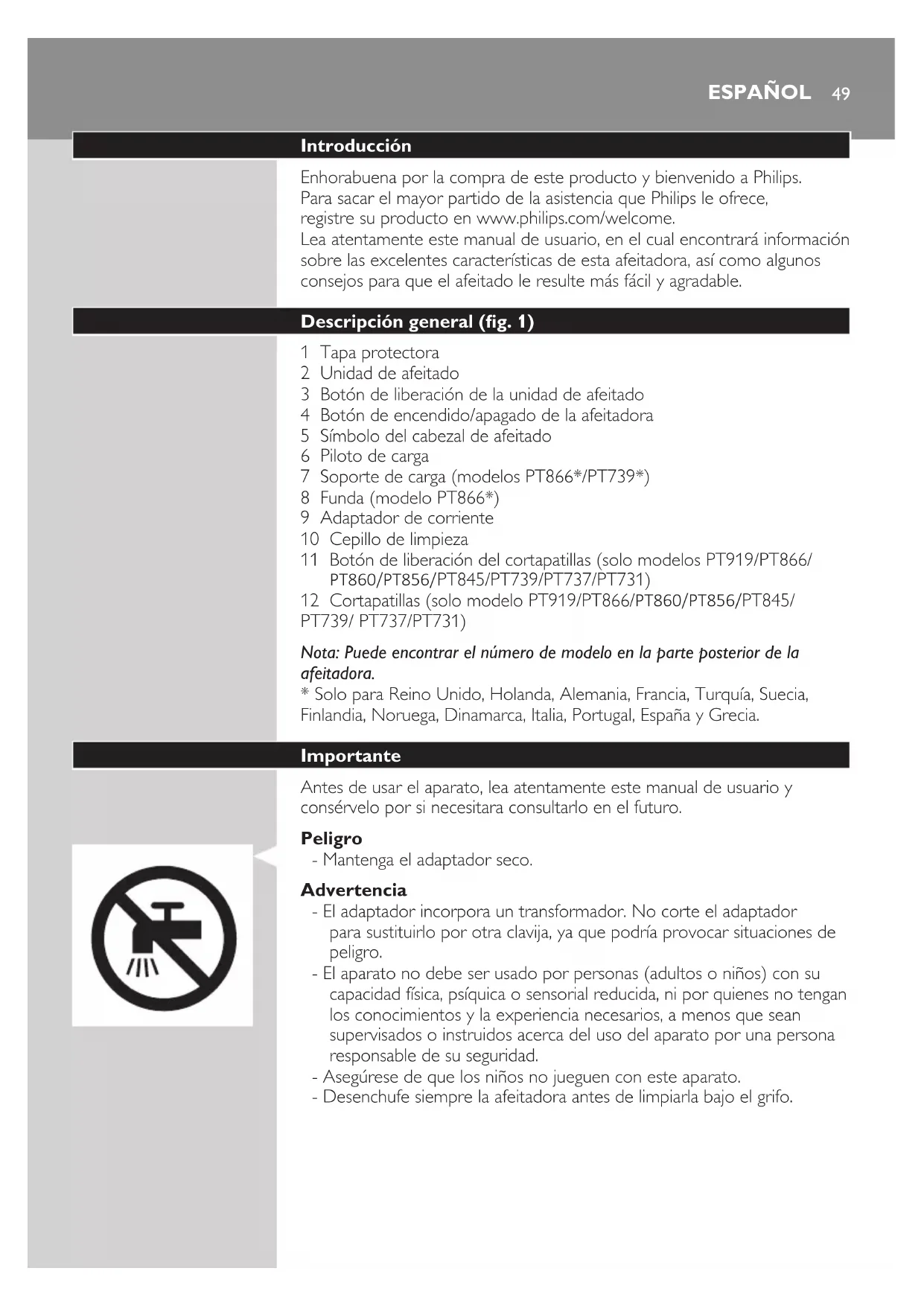 - Solo para Reino Unido, Holanda, Alemania, Francia, Turquía, Suecia, Finlandia, Noruega, Dinamarca, Italia, Portugal, España y Grecia. Importante Antes de usar el aparato, lea atentamente este manual de usuario y consérvelo por si necesitara consultarlo en el futuro. Peligro - Mantenga el adaptador seco. Advertencia - El adaptador incorpora un transformador. No corte el adaptador para sustituirlo por otra clavija, ya que podría provocar situaciones de peligro. - El aparato no debe ser usado por personas (adultos o niños) con su capacidad física, psíquica o sensorial reducida, ni por quienes no tengan los conocimientos y la experiencia necesarios, a menos que sean supervisados o instruidos acerca del uso del aparato por una persona responsable de su seguridad. - Asegúrese de que los niños no jueguen con este aparato. - Desenchufe siempre la afeitadora antes de limpiarla bajo el grifo. ESPAÑOLPrecaución - No sumerja nunca la afeitadora en agua. - No utilice la afeitadora en la bañera o en la ducha. - No utilice nunca agua a una temperatura superior a 80 °C para enjuagar la afeitadora. - Tenga cuidado con el agua caliente. Compruebe siempre que el agua no esté demasiado caliente para evitar quemarse las manos. - La afeitadora no puede lavarse en el lavavajillas. - Cuando enjuague la afeitadora es posible que salga agua por el oricio de su parte inferior. Esto es normal y no es peligroso, ya que todos los sistemas electrónicos están dentro de una unidad motora hermética en el interior de la afeitadora. - No utilice la afeitadora, el adaptador ni ninguna otra pieza si están dañados, ya que podría ocasionar lesiones. Sustituya siempre un adaptador, un cargador o una pieza dañados con uno del modelo original. - Utilice y guarde el aparato a una temperatura entre 10 °C y 35 °C. - Coloque y utilice siempre la afeitadora sobre una supercie resistente a los líquidos. - Utilice sólo el adaptador, el cargador y los accesorios suministrados. - Coloque siempre la tapa protectora en la afeitadora para evitar daños y que la suciedad se acumule en los cabezales de afeitado. Cumplimiento de normas - Este aparato de Philips cumple los estándares y las normativas sobre exposición a campos electromagnéticos (EMF) y se puede limpiar con seguridad bajo el grifo. General - El aparato está equipado con un selector automático de voltaje y es apto para voltajes de red entre 100 y 240 voltios. - El adaptador transforma la corriente de 100 - 240 voltios en un bajo voltaje de seguridad inferior a 24 voltios. Carga Modelos PT919/PT866/PT860: Se tarda aproximadamente 1 hora en cargar completamente la afeitadora. Modelos PT845/PT739/PT737/PT731/PT730//PT727/PT726/ PT725/PT721/PT720: Se tarda aproximadamente 8 horas en cargar completamente la afeitadora. Cuando cargue la afeitadora por primera vez, o después de un largo periodo sin usarla, cárguela hasta que el piloto de carga se ilumine de manera continua. Una afeitadora completamente cargada proporciona hasta 50 minutos (modelos PT919/PT866/PT860) o hasta 45 minutos de afeitado (modelos PT845/PT739/PT737/PT731/PT730//PT727/PT726/PT725/PT721/PT720). El tiempo de afeitado puede ser inferior a 50 minutos (modelos PT919/ PT866/PT860) o 45 minutos de afeitado (modelos PT845/PT739/PT737/ PT731/PT730//PT727/PT726/PT725/PT721/PT720) como resultado de su forma de afeitarse, sus hábitos de limpieza o su tipo de barba. ESPAÑOL50Indicaciones de carga Batería baja - Cuando la batería está casi descargada (cuando quedan 5 minutos o menos de afeitado), el piloto de carga comienza a parpadear en naranja. - Al apagar la afeitadora, el piloto de carga sigue parpadeando en naranja durante unos segundos. Carga rápida - Cuando comienza a cargar la batería descargada, el piloto de carga parpadea de forma alterna en naranja y blanco. Después de aproximadamente 3 minutos, el piloto de carga continúa parpadeando en blanco. La afeitadora contiene ahora suciente energía para un afeitado de 5 minutos. Carga - Cuando la afeitadora se está cargando, el piloto de carga parpadea en blanco. Batería completamente cargada - Cuando la batería está completamente cargada, el piloto de carga permanece encendido en blanco. Nota: El piloto de carga se apaga después de unos 30 minutos para ahorrar energía. Carga con el adaptador 1 Enchufe la clavija pequeña a la afeitadora. 2 Enchufe el adaptador a la toma de corriente. , El piloto de carga muestra el estado de carga de la afeitadora (consulte la sección “Indicaciones de carga” en este capítulo). Carga en el soporte de carga (solo modelos PT866/PT739) 1 Enchufe la clavija pequeña al soporte de carga. 2 Enchufe el adaptador a la toma de corriente. 3 Coloque la afeitadora en el soporte de carga. , El piloto de carga muestra el estado de carga de la afeitadora (consulte la sección “Indicaciones de carga” en este capítulo). ESPAÑOL 51Utilización de la afeitadora Nota: Usted también puede utilizar la afeitadora enchufada directamente a la red eléctrica. Solo tiene que enchufarla a la red eléctrica. Afeitado 1 Pulse el botón de encendido/apagado una vez para encender la afeitadora. 2 Desplace los cabezales de afeitado sobre la piel, haciendo movimientos circulares. - Puede que su piel necesite de 2 a 3 semanas para acostumbrarse al sistema de afeitado Philips. 3 Pulse el botón de encendido/apagado una vez para apagar la afeitadora. 4 Limpie la afeitadora (consulte el capítulo “Limpieza y mantenimiento”). Cómo recortar (solo modelos PT919/PT866/PT860/PT856/ PT845/PT739/PT737/PT731) Puede utilizar el recortador para recortar las patillas y el bigote. 1 Pulse el botón de encendido/apagado una vez para encender la afeitadora. 2 Deslice el botón del cortapatillas hacia abajo para abrirlo. , Ya puede comenzar a utilizar el recortador. 3 Una vez nalizado el corte, cierre el cortapatillas y apague la afeitadora. ESPAÑOL52Limpieza y mantenimiento No utilice nunca aire comprimido, estropajos, agent