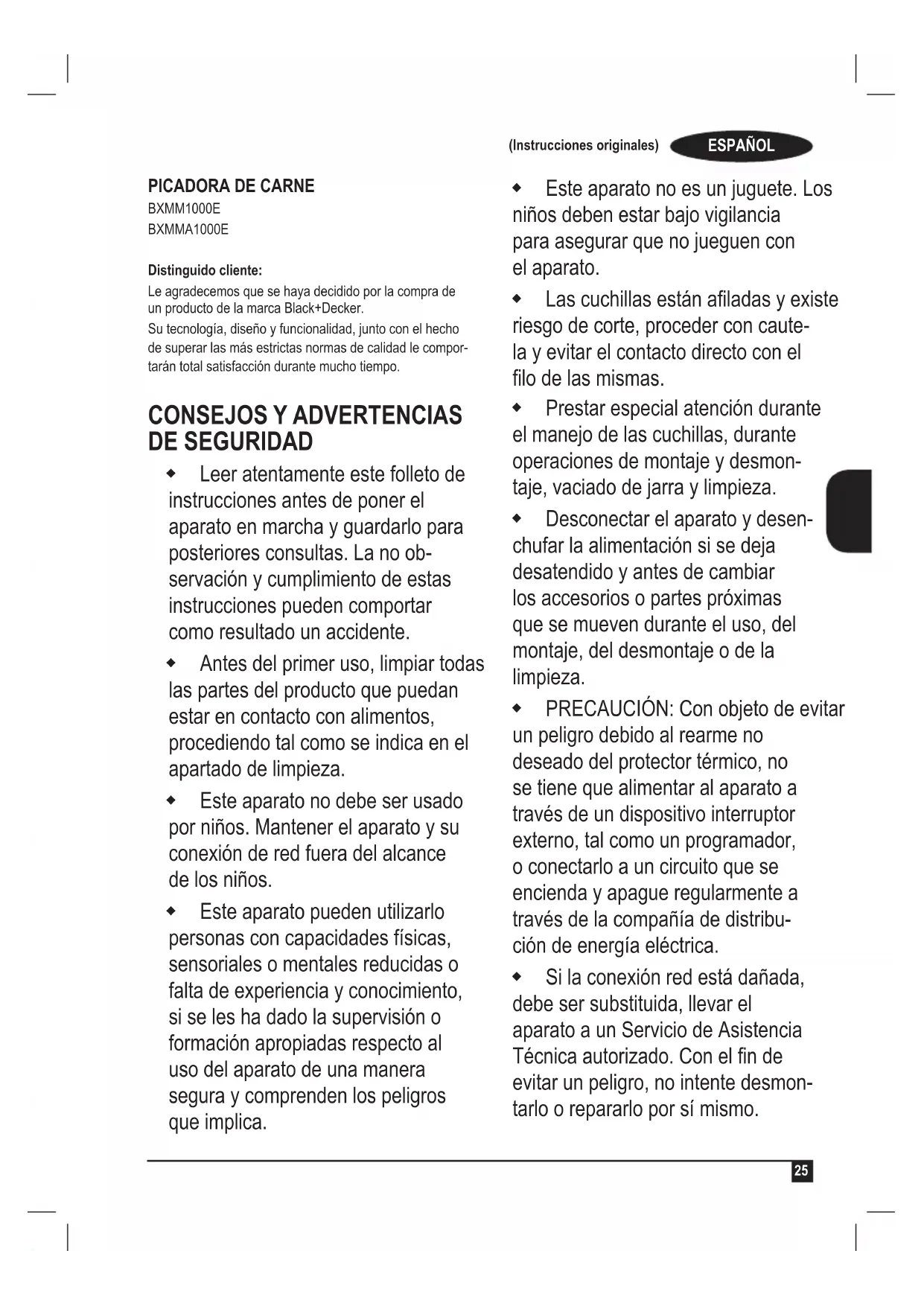 BXMM1000E BXMMA1000E Distinguido cliente: Le agradecemos que se haya decidido por la compra de un producto de la marca Black+Decker. Su tecnología, diseño y funcionalidad, junto con el hecho de superar las más estrictas normas de calidad le compor- tarán total satisfacción durante mucho tiempo.