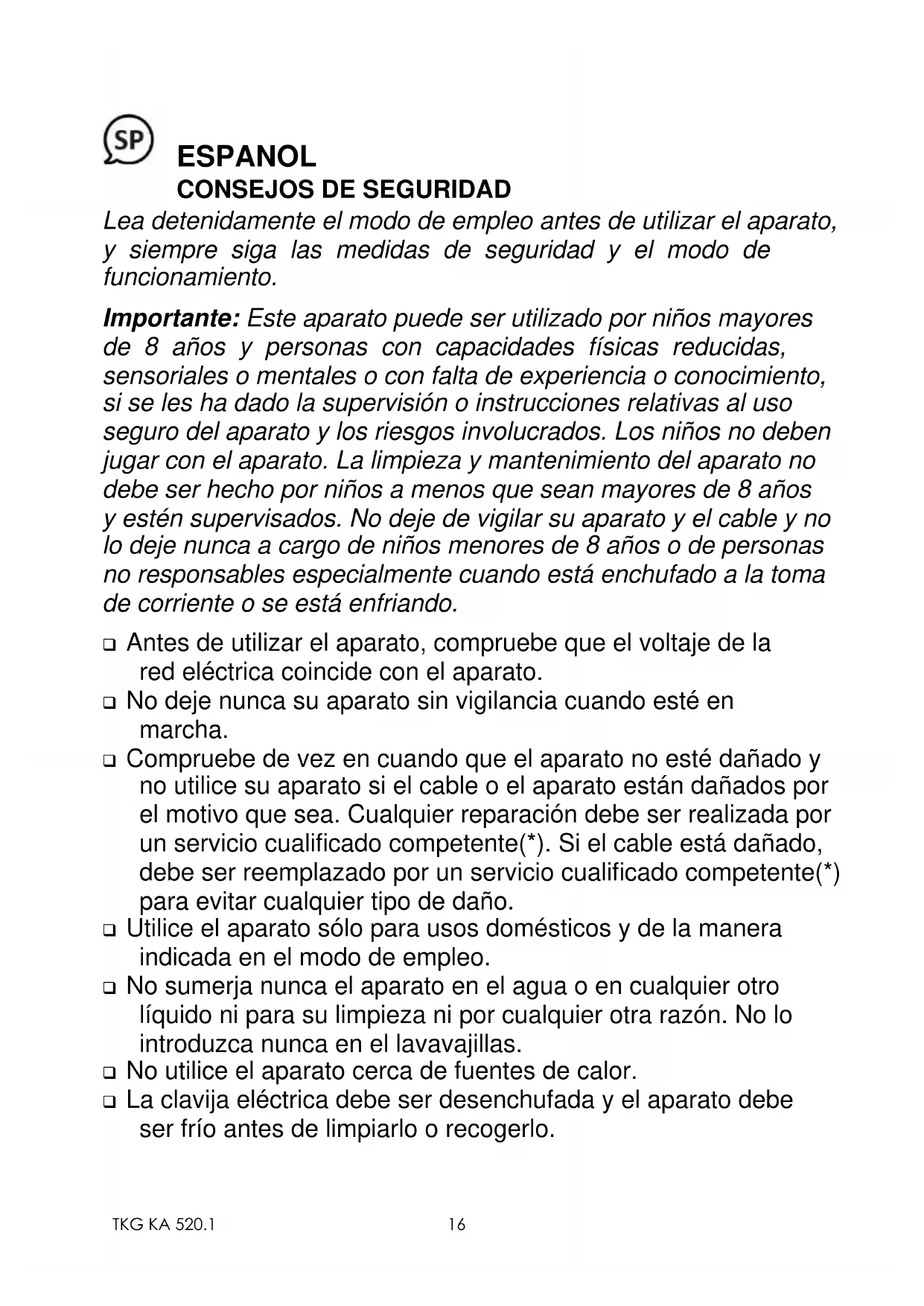 Lea detenidamente el modo de empleo antes de utilizar el aparato, y siempre siga las medidas de seguridad y el modo de funcionamiento. Importante: Este aparato puede ser utilizado por niños mayores de 8 años y personas con capacidades físicas reducidas, sensoriales o mentales o con falta de experiencia o conocimiento, si se les ha dado la supervisión o instrucciones relativas al uso seguro del aparato y los riesgos involucrados. Los niños no deben jugar con el aparato. La limpieza y mantenimiento del aparato no debe ser hecho por niños a menos que sean mayores de 8 años y estén supervisados. No deje de vigilar su aparato y el cable y no lo deje nunca a cargo de niños menores de 8 años o de personas no responsables especialmente cuando está enchufado a la toma de corriente o se está enfriando. ❑ Antes de utilizar el aparato, compruebe que el voltaje de la red eléctrica coincide con el aparato. ❑ No deje nunca su aparato sin vigilancia cuando esté en marcha. ❑ Compruebe de vez en cuando que el aparato no esté dañado y no utilice su aparato si el cable o el aparato están dañados por el motivo que sea. Cualquier reparación debe ser realizada por un servicio cualificado competente(*). Si el cable está dañado, debe ser reemplazado por un servicio cualificado competente(*) para evitar cualquier tipo de daño. ❑ Utilice el aparato sólo para usos domésticos y de la manera indicada en el modo de empleo. ❑ No sumerja nunca el aparato en el agua o en cualquier otro líquido ni para su limpieza ni por cualquier otra razón. No lo introduzca nunca en el lavavajillas. ❑ No utilice el aparato cerca de fuentes de calor. ❑ La clavija eléctrica debe ser desenchufada y el aparato debe ser frío antes de limpiarlo o recogerlo.17 TKG KA 520.1