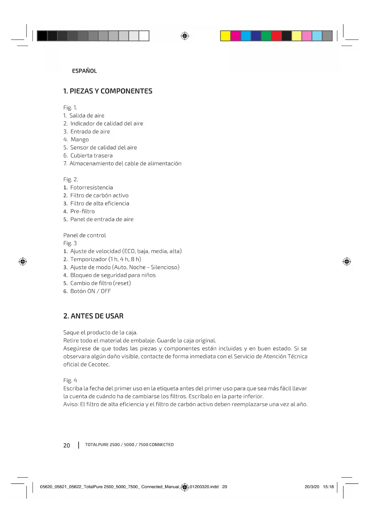 Saque el producto de la caja. Retire todo el material de embalaje. Guarde la caja original. Asegúrese de que todas las piezas y componentes están incluidas y en buen estado. Si se observara algún daño visible, contacte de forma inmediata con el Servicio de Atención Técnica oficial de Cecotec. Fig. 4 Escriba la fecha del primer uso en la etiqueta antes del primer uso para que sea más fácil llevar la cuenta de cuándo ha de cambiarse los filtros. Escríbalo en la parte inferior. Aviso: El filtro de alta eficiencia y el filtro de carbón activo deben reemplazarse una vez al año. 05620_05621_05622_TotalPure 2500_5000_7500_ Connected_Manual_YV_01200320.indd 2005620_05621_05622_TotalPure 2500_5000_7500_ Connected_Manual_YV_01200320.indd 20 20/3/20 15:1820/3/20 15:18TOTALPURE 2500 / 5000 / 7500 CONNECTED