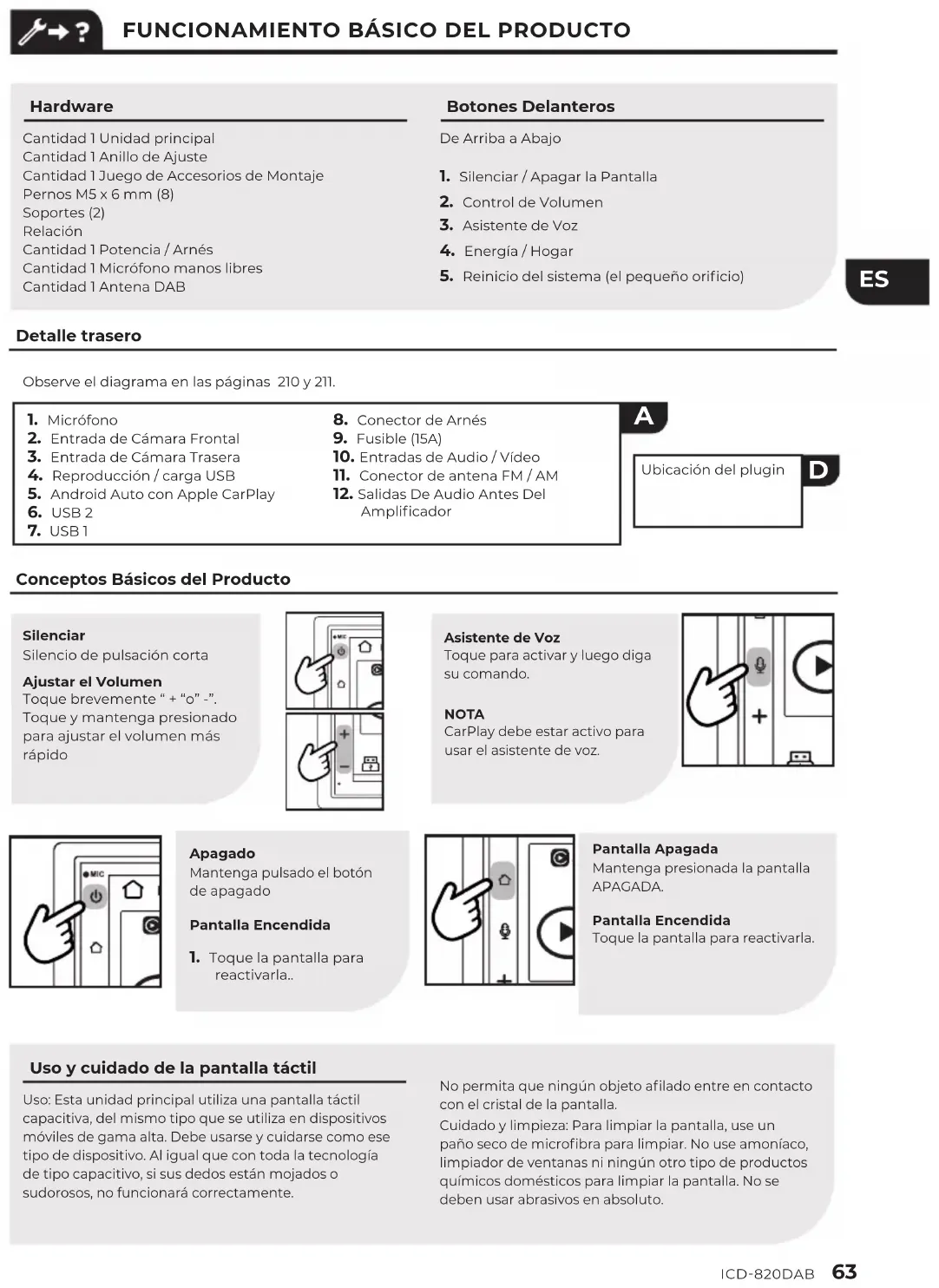 64 ICD-820DAB Opción A Opción B APPLE CARPLAY Conguración del Producto (Fecha y Hora ) Opción de Conguración A: Conecte su dispositivo Apple ® con un cable Lightning ® . Se debe utilizar el puerto USB de CarPlay. Esto congurará automáticamente la hora y la fecha. Los usuarios deben establecer la zona horaria manualmente. El valor predeterminado es la Zona Horaria del Pacíco. Opción de Conguración B: Fecha y Hora Conguración Adicional General > Idioma Audio > Ecualizador, Otros Ajustes de Audio Pantalla > Iluminación, Brillo Uso de Carplay El uso de Apple CarPlay es limitado mientras se conduce. Las funciones, el contenido y la usabilidad están determinados por el proveedor o proveedores de la aplicación. Los controles variarán con cada aplicación que esté disponible para CarPlay. For more details visit: http://www.apple.com/ios/ carplay Conectar al puerto USB de Carplay