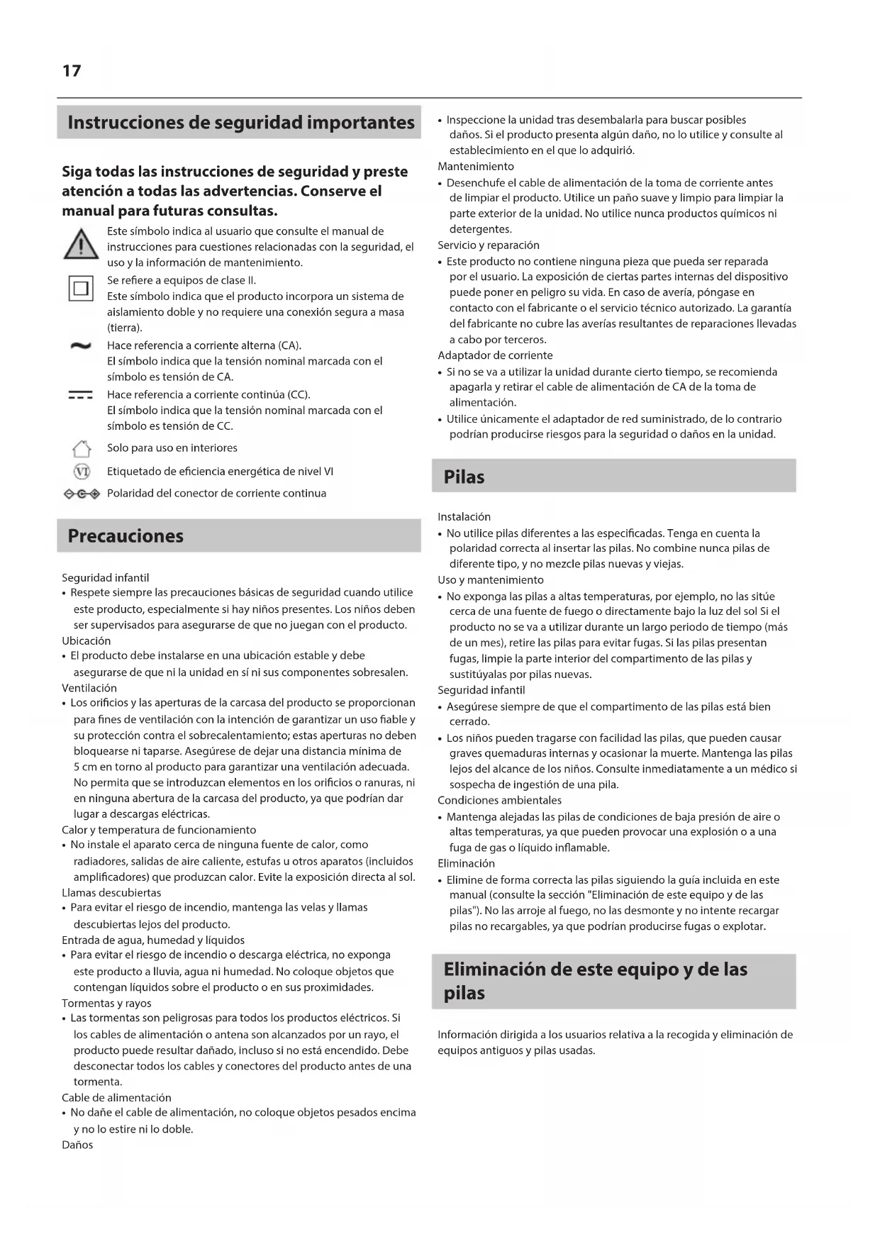 Este símbolo indica al usuario que consulte el manual de instrucciones para cuestiones relacionadas con la seguridad, el uso y la información de mantenimiento. Se reere a equipos de claseII. Este símbolo indica que el producto incorpora un sistema de aislamiento doble y no requiere una conexión segura a masa (tierra). Hace referencia a corriente alterna (CA). El símbolo indica que la tensión nominal marcada con el símbolo es tensión de CA. Hace referencia a corriente continúa (CC). El símbolo indica que la tensión nominal marcada con el símbolo es tensión de CC. Solo para uso en interiores Etiquetado de eciencia energética de nivelVI Polaridad del conector de corriente continua Precauciones Seguridad infantil