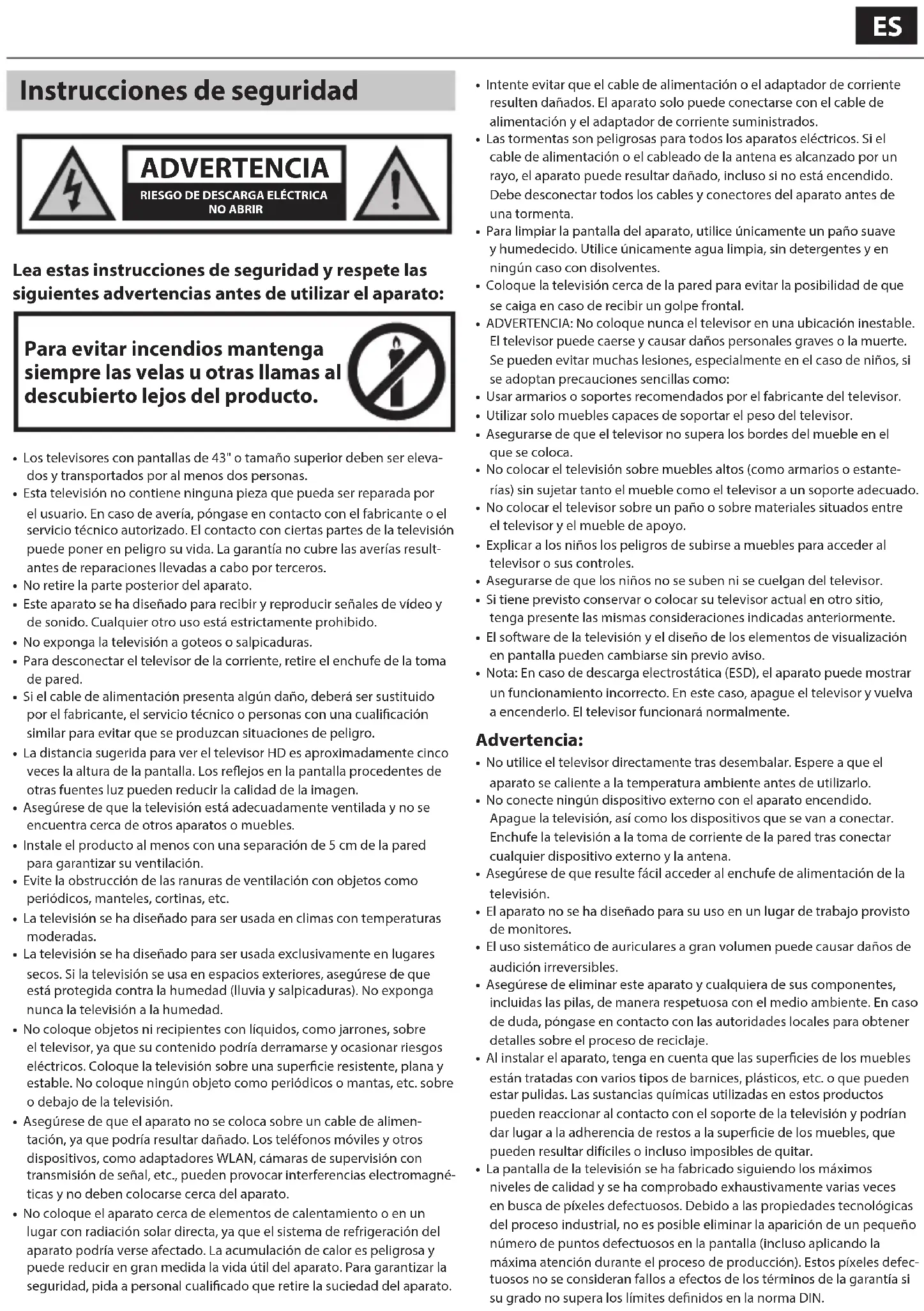 - Nota: En caso de descarga electrostática (ESD), el aparato puede mostrar un funcionamiento incorrecto. En este caso, apague el televisor y vuelva a encenderlo. El televisor funcionará normalmente. Advertencia: