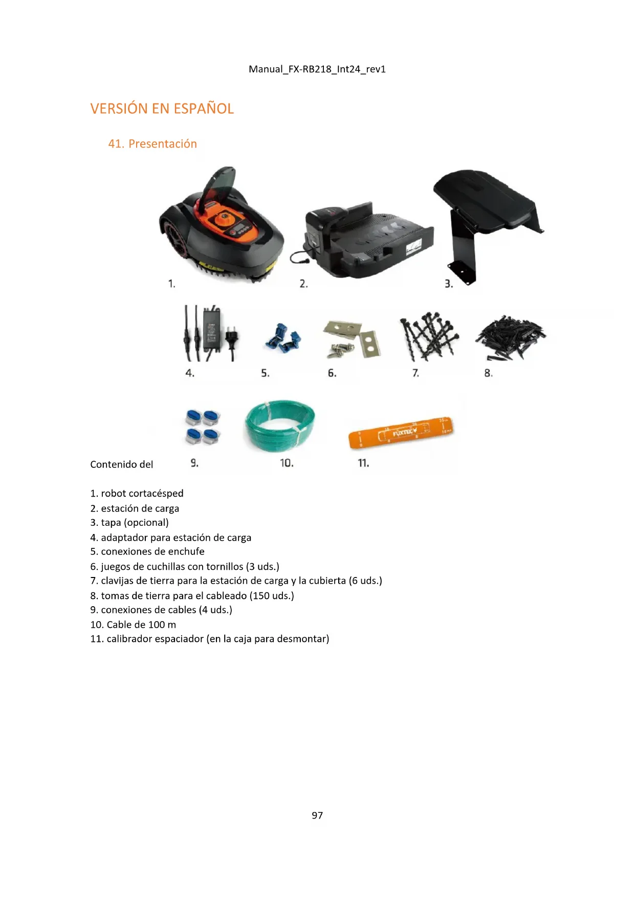 - En general, la duración de la batería es de 5 años, dependiendo de la carga de trabajo y del mantenimiento del robot cortacésped. Nota: ¡Utilice siempre piezas de repuesto originales/autorizadas!Manual_FX-RB218_Int24_rev1