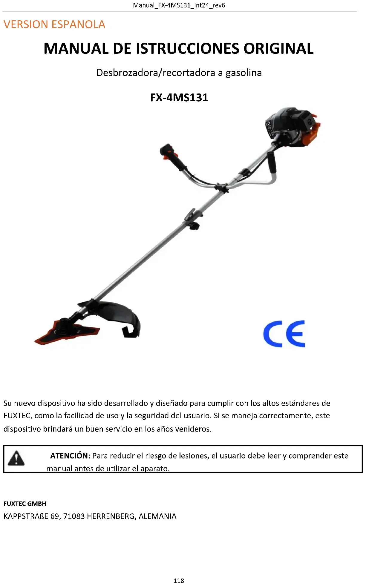 Descripción del dispositivo: Machine Description: Desbrozadora/cortabordes de gasolina Tipo di dispositivo: Machine Type: FX-4MS131 Marca: Trade name FUXTEC Capacidad cúbica 31cm