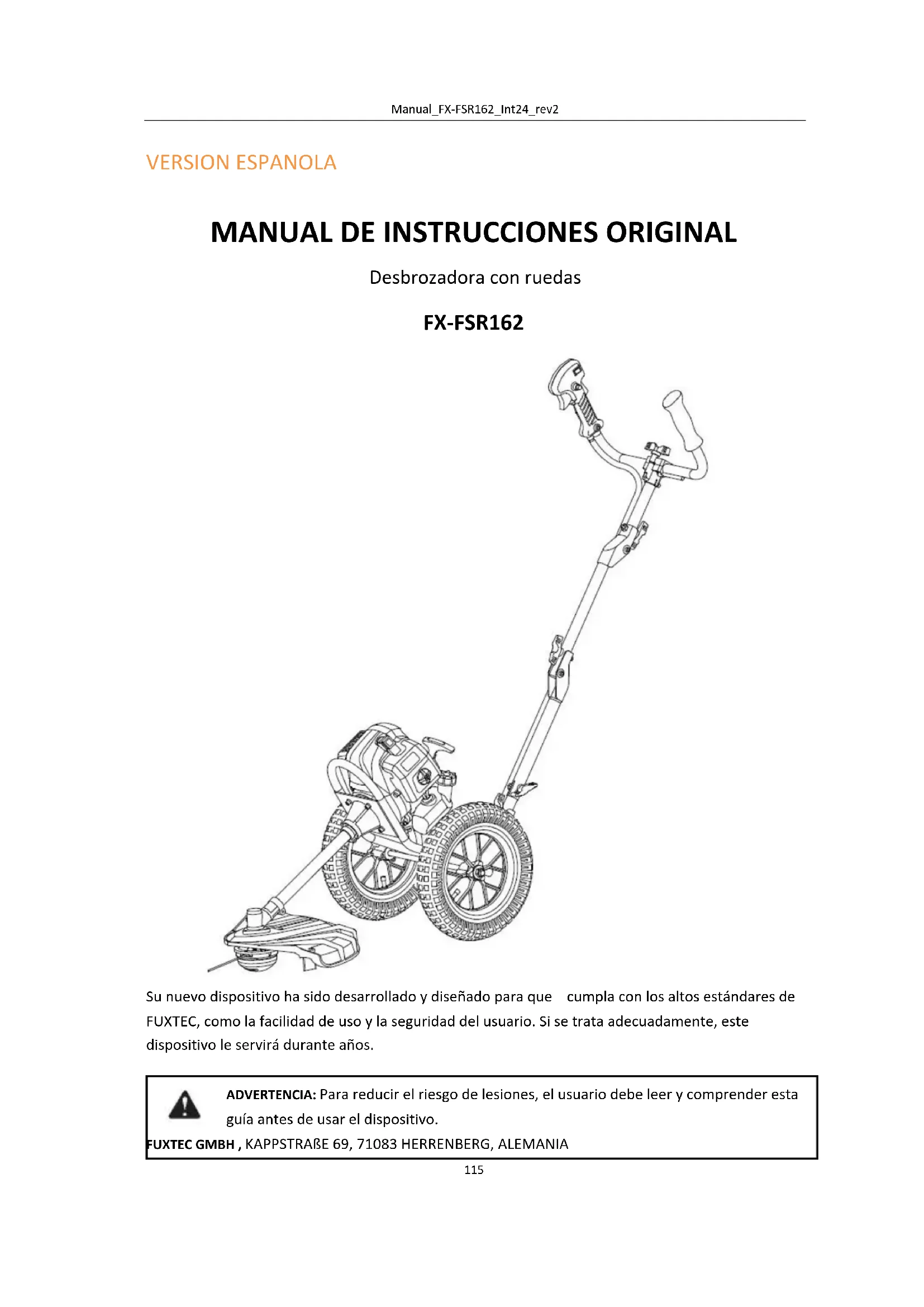 Su nuevo dispositivo ha sido desarrollado y diseñado para que cumpla con los altos estándares de FUXTEC, como la facilidad de uso y la seguridad del usuario. Si se trata adecuadamente, este dispositivo le servirá durante años. ADVERTENCIA: Para reducir el riesgo de lesiones, el usuario debe leer y comprender esta guía antes de usar el dispositivo. FUXTEC GMBH , KAPPSTRAßE 69, 71083 HERRENBERG, ALEMANIAManual_FX-FSR162_Int24_rev2