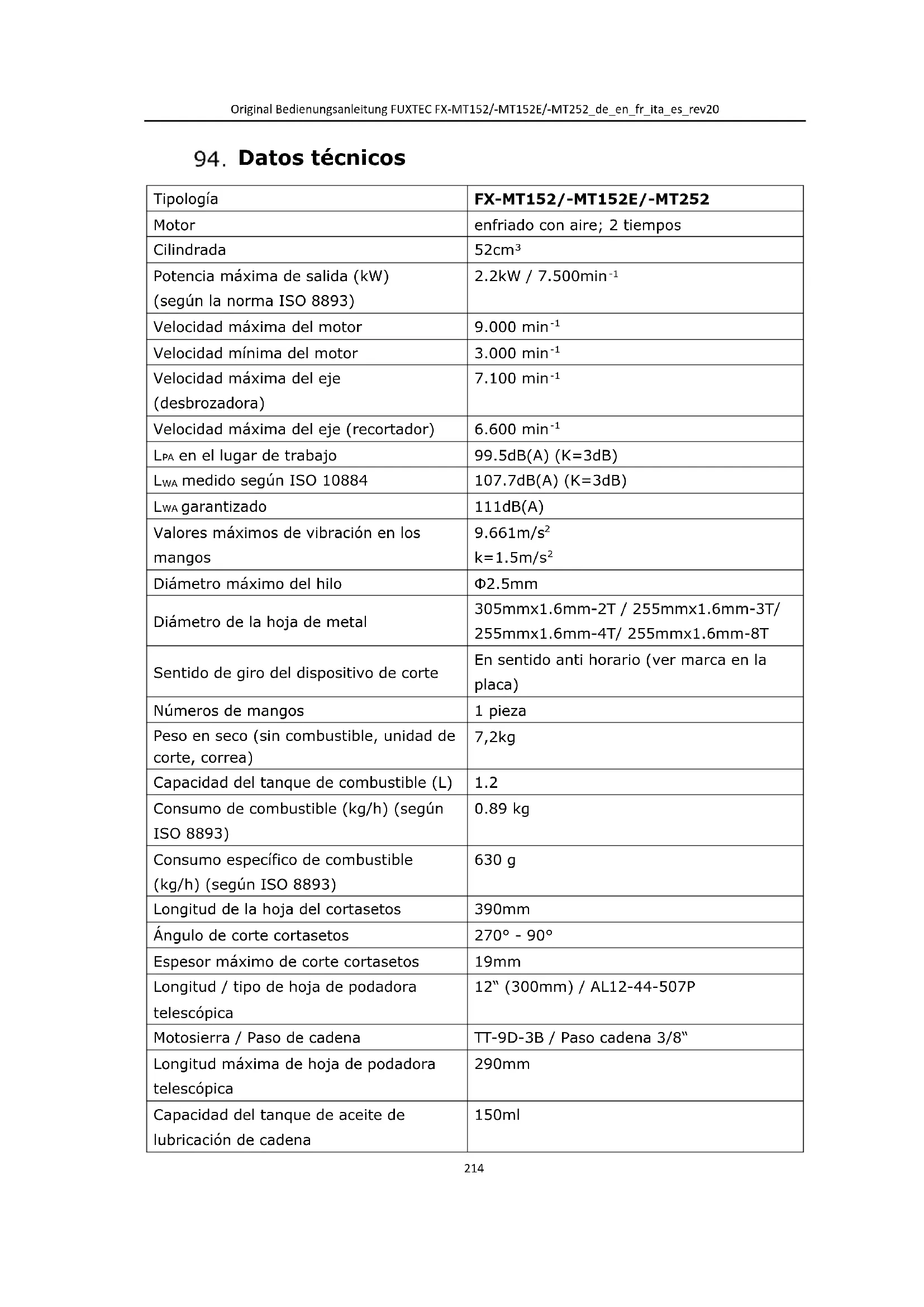 Consumo específico de combustible (kg/h) (según ISO 8893) 630 g Longitud de la hoja del cortasetos 390mm Ángulo de corte cortasetos 270° - 90° Espesor máximo de corte cortasetos 19mm Longitud / tipo de hoja de podadora telescópica 12“ (300mm) / AL12-44-507P Motosierra / Paso de cadena TT-9D-3B / Paso cadena 3/8“ Longitud máxima de hoja de podadora telescópica 290mm Capacidad del tanque de aceite de lubricación de cadena 150mlOriginal Bedienungsanleitung FUXTEC FX-MT152/-MT152E/-MT252_de_en_fr_ita_es_rev20