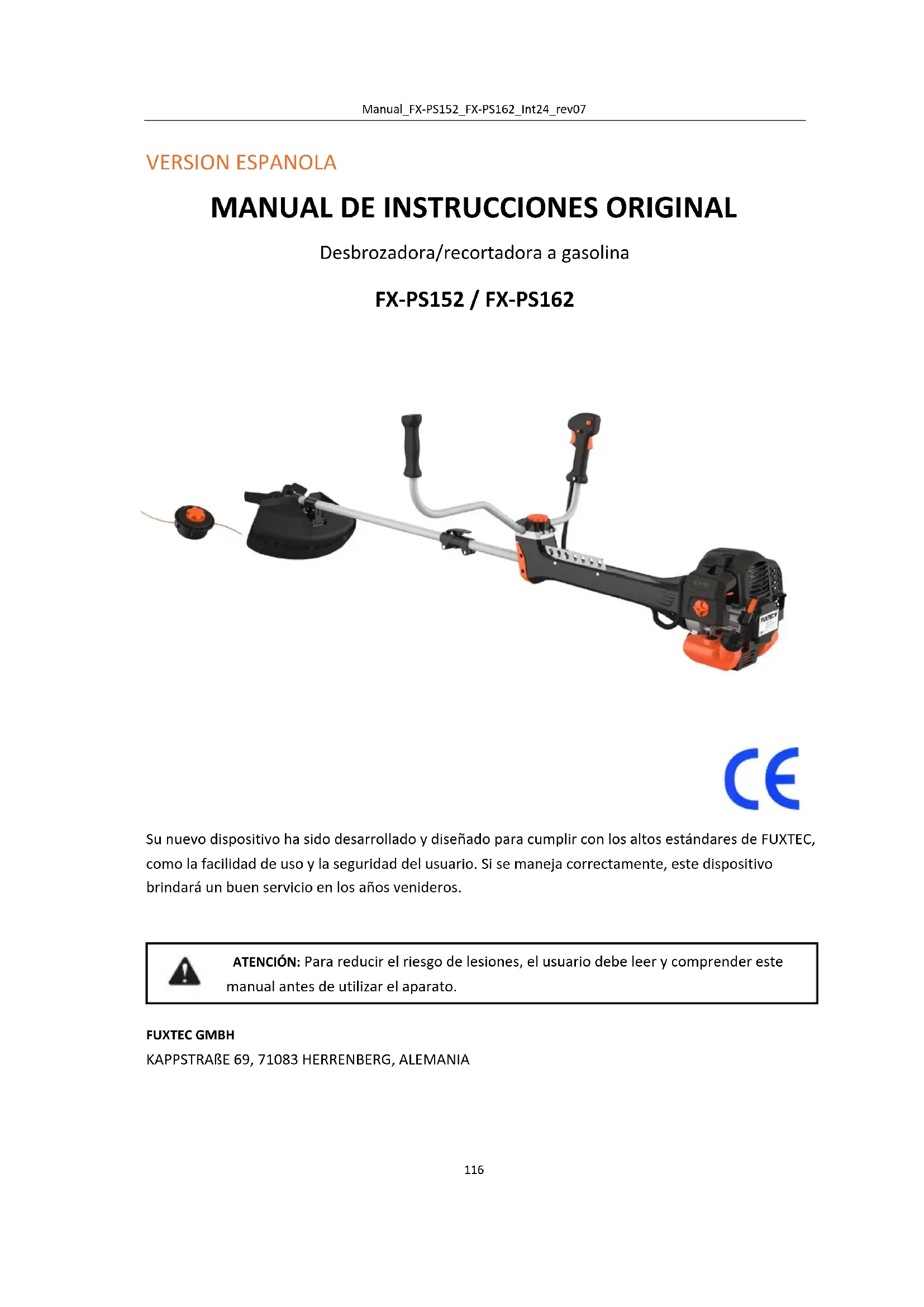 ATENCIÓN: Para reducir el riesgo de lesiones, el usuario debe leer y comprender este manual antes de utilizar el aparato. FUXTEC GMBH KAPPSTRAßE 69, 71083 HERRENBERG, ALEMANIAManual_FX-PS152_FX-PS162_Int24_rev07