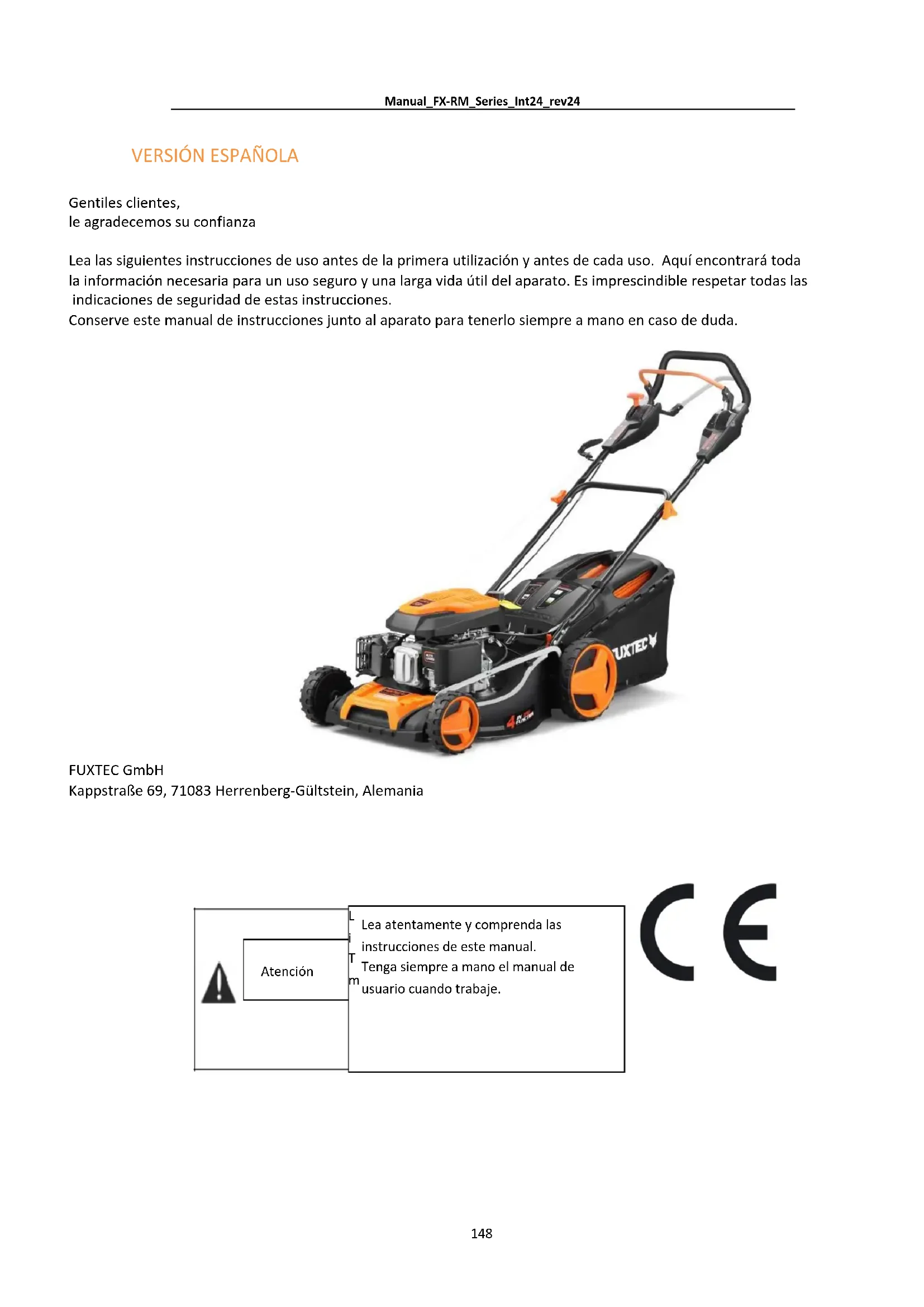 Lea atentamente las instrucciones de uso. Familiarícese con los controles y el uso correcto del aparato. No coloque nunca las manos o los pies cerca de las partes giratorias del aparato. Manténgase siempre alejado de la abertura de salida. Sólo permita que lo utilicen usuarios responsables que estén familiarizados con el funcionamiento de este aparato. Compruebe cuidadosamente la zona donde se va a utilizar el aparato y elimine cualquier objeto (como piedras, juguetes, palos, cables, etc.) que pueda salir despedido del aparato. No utilice nunca el aparato si hay personas cerca, especialmente niños o animales domésticos. Cuando utilice el aparato, lleve siempre calzado resistente y pantalones largos. No utilice el aparato si está descalzo o lleva sandalias abiertas. No tire del dispositivo hacia atrás a menos que sea absolutamente necesario. Mire siempre hacia abajo y hacia atrás antes y mientras mueve el aparato hacia atrás. No utilice nunca el aparato con protecciones defectuosas o desprotegidas, como deflectores y recortes mal instalados. Utilice únicamente los accesorios recomendados por el fabricante.Detenga las cuchillas al cruzar calzadas, caminos o carreteras de grava. Detenga el motor y retire el conector de la bujía, asegúrese de que todas las piezas móviles estén detenidas: - antes de retirar los bloques y limpiar el canal de corte. - antes de revisar, limpiar o realizar cualquier trabajo en la unidad. - después de detectar un objeto extraño. Compruebe si el dispositivo está dañado y repárelo antes de volver a utilizar el cortacésped. - compruebe inmediatamente el cortacésped si vibra de forma inusual. Apague el motor y espere a que las cuchillas se detengan por completo antes de remover el retén de cuchillas. Utiliza el aparato sólo a la luz del día o en zonas bien iluminadas con luz artificial. No utilice el dispositivo si está bajo la influencia del alcohol o las drogas. No utilice nunca el aparato sobre hierba húmeda. Un soporte inestable puede hacer que el cortacésped resbale. Sujete las empuñaduras con firmeza al cortar el césped. Suelte el mecanismo de autopropulsión antes de arrancar el motor. Sustituir los silenciadores defectuosos. Utilice siempre gafas de seguridad o máscaras de protección con protectores laterales cuando maneje el cortacésped. Retire los obstáculos como piedras, restos de árboles, etc. Tenga cuidado con las zanjas, los baches o los golpes. La hierba alta puede ocultar objetos extraños. No corte en elevaciones, zanjas o terraplenes. El usuario del cortacésped puede perder el agarre y el equilibrio. No corte en pendientes demasiado pronunciadas. El usuario del cortacésped es responsable de los accidentes o daños a otras personas o bienes. Tenga cuidado y apague la unidad si los niños entran en la zona de trabajo. Siegue horizontalmente y no verticalmente en la pendiente con máquinas rotativas. No permita nunca que niños o personas no familiarizadas con el funcionamiento de este cortacésped lo manejen. La normativa local puede limitar la edad del usuario. ADVERTENCIAS - La gasolina es altamente inflamable. - Almacene la gasolina en contenedores de gasolina. - Llene el depósito sólo en el exterior. No fume nunca al llenar el depósito. - Añada gasolina antes de arrancar el motor. No retire nunca la tapa de llenado ni llene el tanque de gasolina con el motor en marcha o todavía caliente. - No arranque nunca el motor si ha salido aceite. Mueve el dispositivo a otro lugar. Evite cualquier tipo de encendido o chispa hasta que los vapores de la gasolina hayan sido completamente eliminados.Manual_FX-RM_Series_Int24_rev24