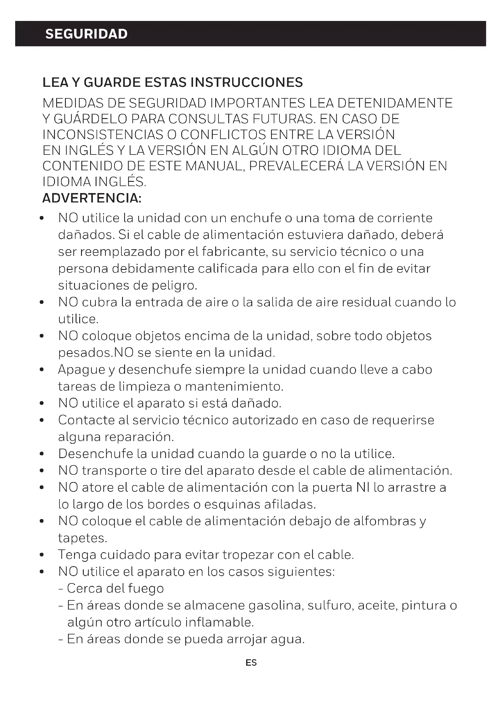 NO utilice la unidad con un enchufe o una toma de corriente dañados. Si el cable de alimentación estuviera dañado, deberá ser reemplazado por el fabricante, su servicio técnico o una persona debidamente calificada para ello con el fin de evitar situaciones de peligro. NO cubra la entrada de aire o la salida de aire residual cuando lo utilice. NO coloque objetos encima de la unidad, sobre todo objetos pesados.NO se siente en la unidad. Apague y desenchufe siempre la unidad cuando lleve a cabo tareas de limpieza o mantenimiento. NO utilice el aparato si está dañado. Contacte al servicio técnico autorizado en caso de requerirse alguna reparación. Desenchufe la unidad cuando la guarde o no la utilice. NO transporte o tire del aparato desde el cable de alimentación. NO atore el cable de alimentación con la puerta NI lo arrastre a lo largo de los bordes o esquinas afiladas. NO coloque el cable de alimentación debajo de alfombras y tapetes. Tenga cuidado para evitar tropezar con el cable. NO utilice el aparato en los casos siguientes: - Cerca del fuego - En áreas donde se almacene gasolina, sulfuro, aceite, pintura o algún otro artículo inflamable. - En áreas donde se pueda arrojar agua.