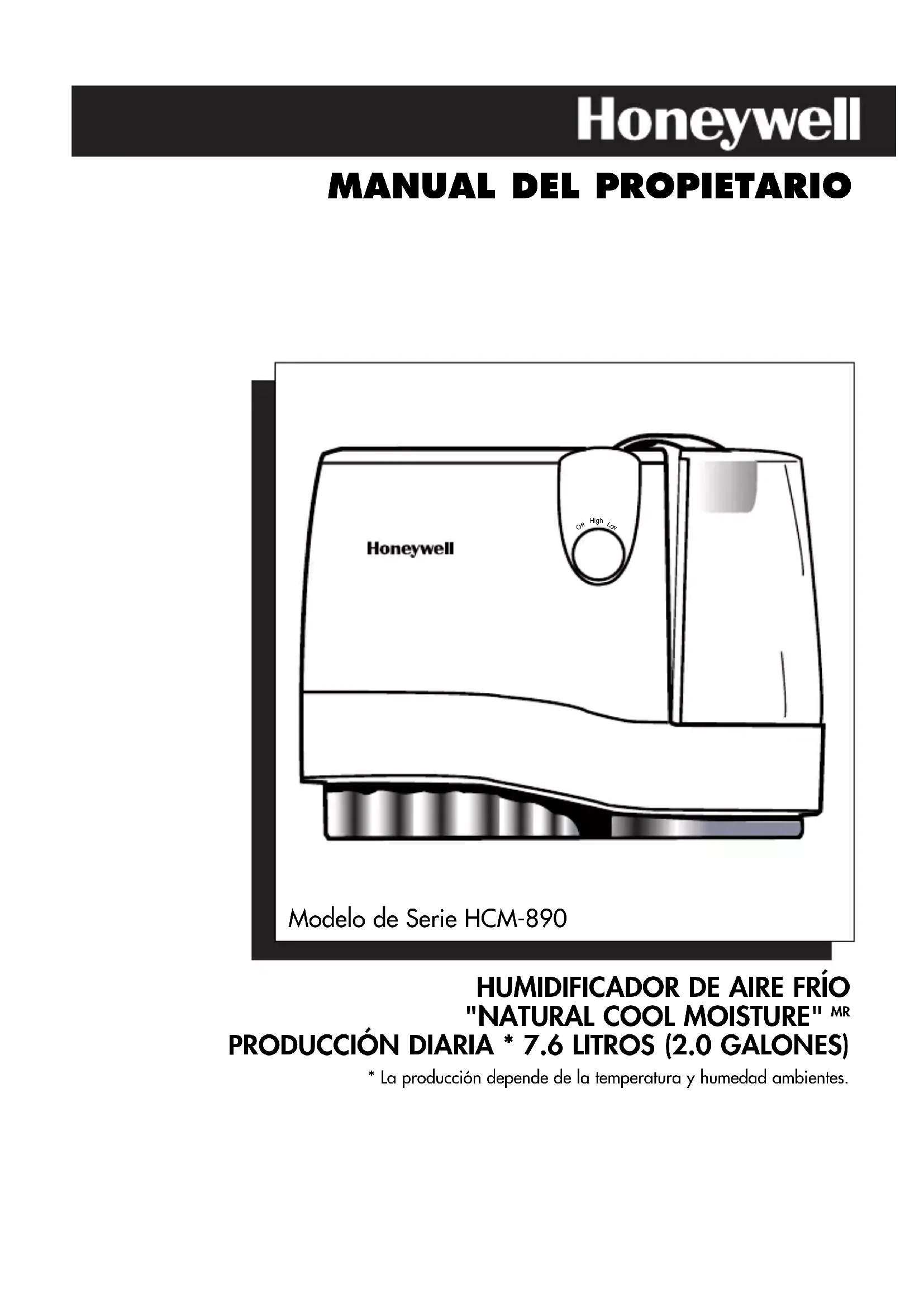 HU4075.01 HCM890/890C Sp 6/14/01 4:15 PM Page 8La capacidad nominal de este producto es de 0.6 amperios, 120 V, 60 Hz. NOTA: SI USTED TIENE ALGÚN PROBLEMA CON SU HUMIDIFICADOR, consulte las instrucciones sobre la garantía, no trate de abrir ni de reparar el humidificador por sí mismo ya que ello anulará la garantía y podría causar daños a la UNIDAD o lesiones personales. Si el problema continúa, comuníquese con el centro de servicio al cliente. Envíe sus preguntas o comentarios a: Honeywell Consumer Service Center 250 Turnpike Road Southborough, MA 01772 USA Por favor especifique el número del modelo. Llámenos al número de teléfono de llamada gratis de larga distancia: 1-800-332-1110 O visítenos en nuestro sitio web: www.honeywell.com/yourhome